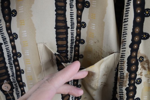 Missing pocket button. Inner collar discolored. Loose threads on buttons