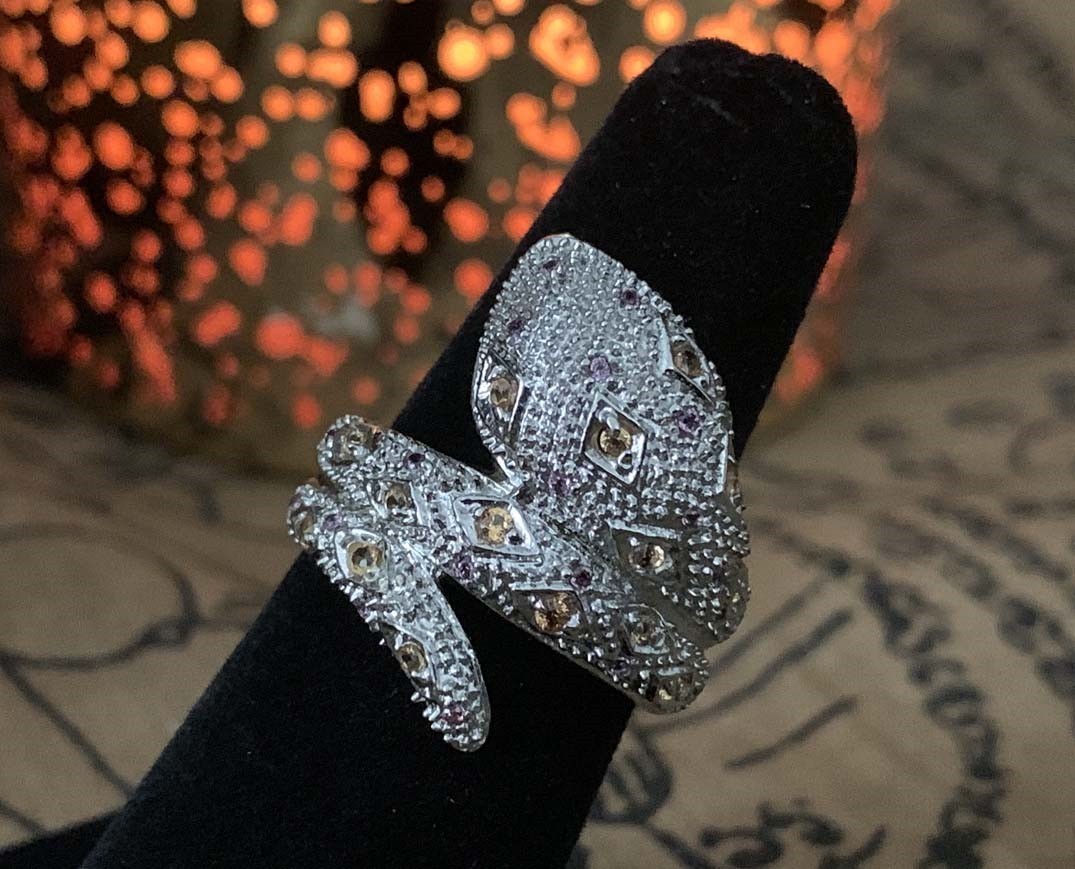 Examination reveals a well made 22k white gold vermeil coiled cobra ring setting displaying fifteen, 1.3 mm faceted round yellow sapphire and twenty-one, .75 mm faceted round pyrope garnet gems which have been prong set as the eyes (yellow sapphire) and along the back of the snake body which are described in further detail below.