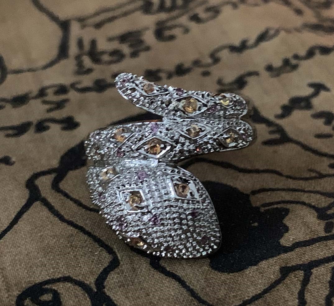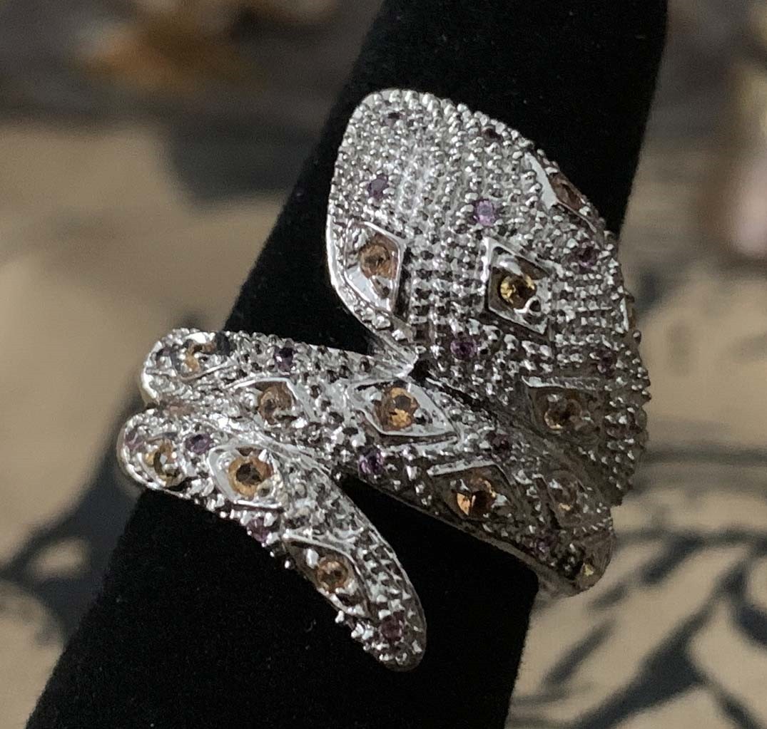 Thai White Gold Vermeil Yellow Sapphire and Garnet Gem Cobra, Naga Ring Voodoo