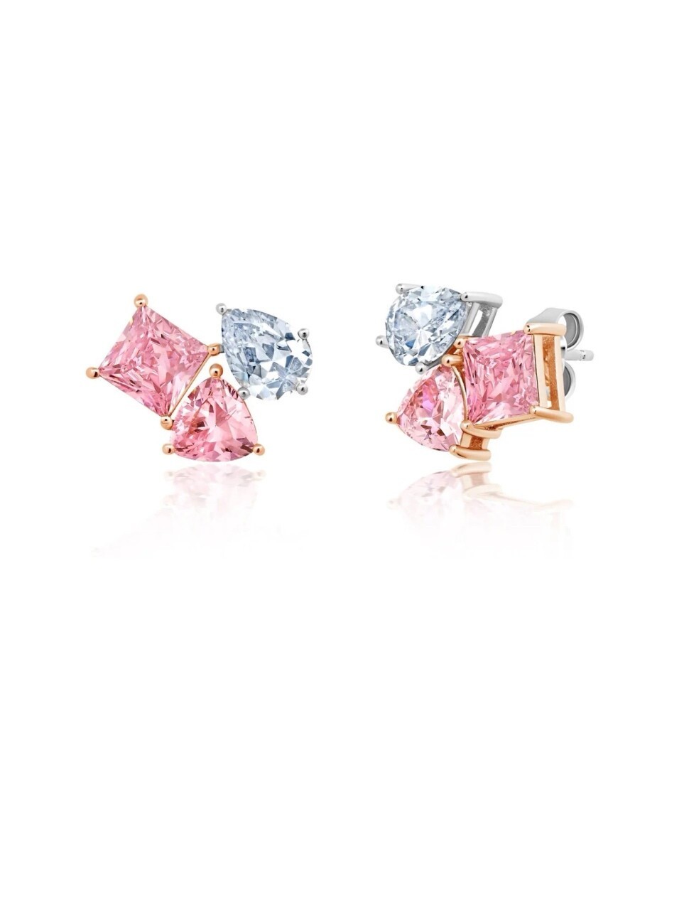 These multi-stone post earrings feature gorgeous trillion, princess, and pear-cut cubic zirconia, crafted in .925 sterling silver and elegantly finished in pure platinum and 18K rose gold.