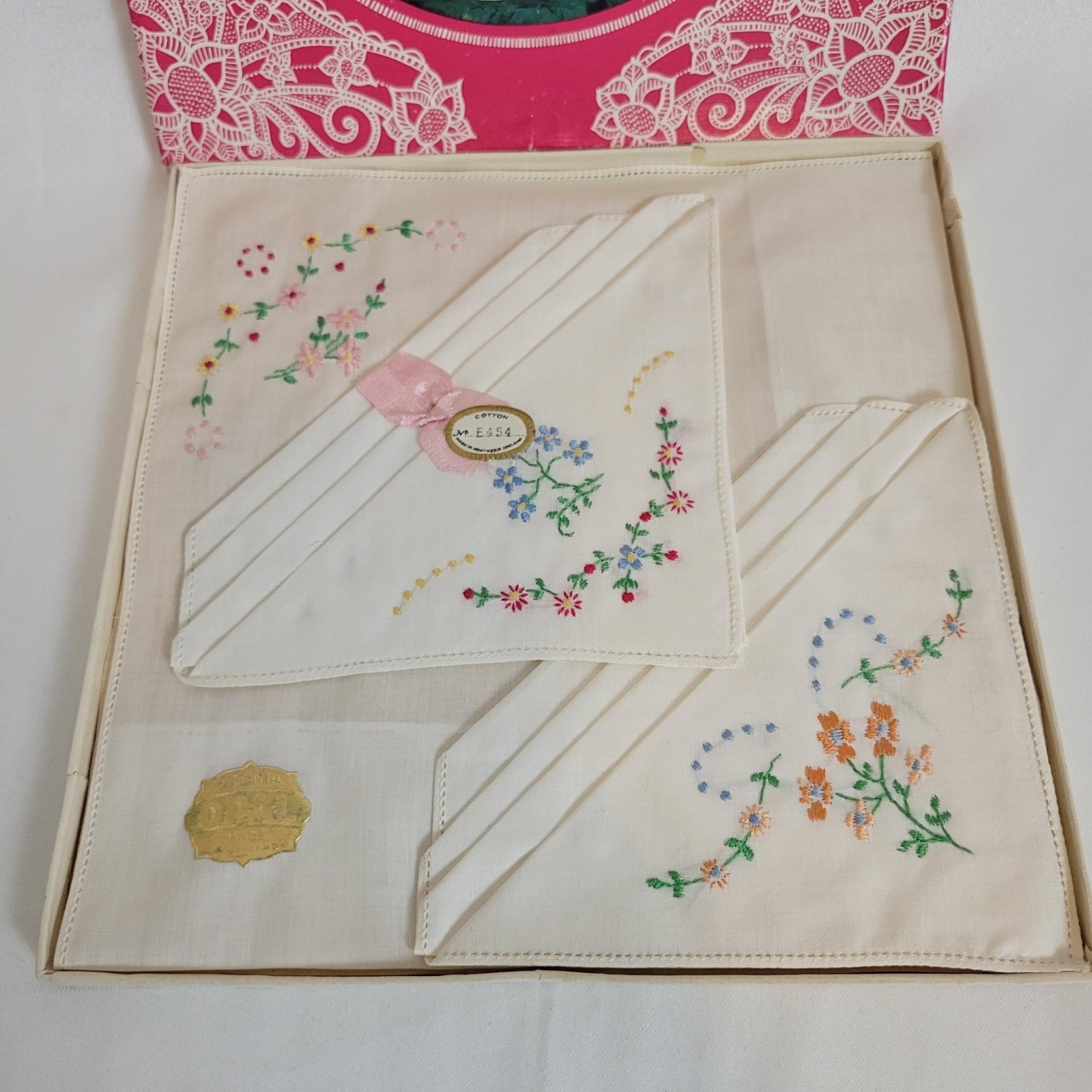 Etonia Opal Ireland Embroidery Handkerchiefs Set Linens Vintage White Pink NOS