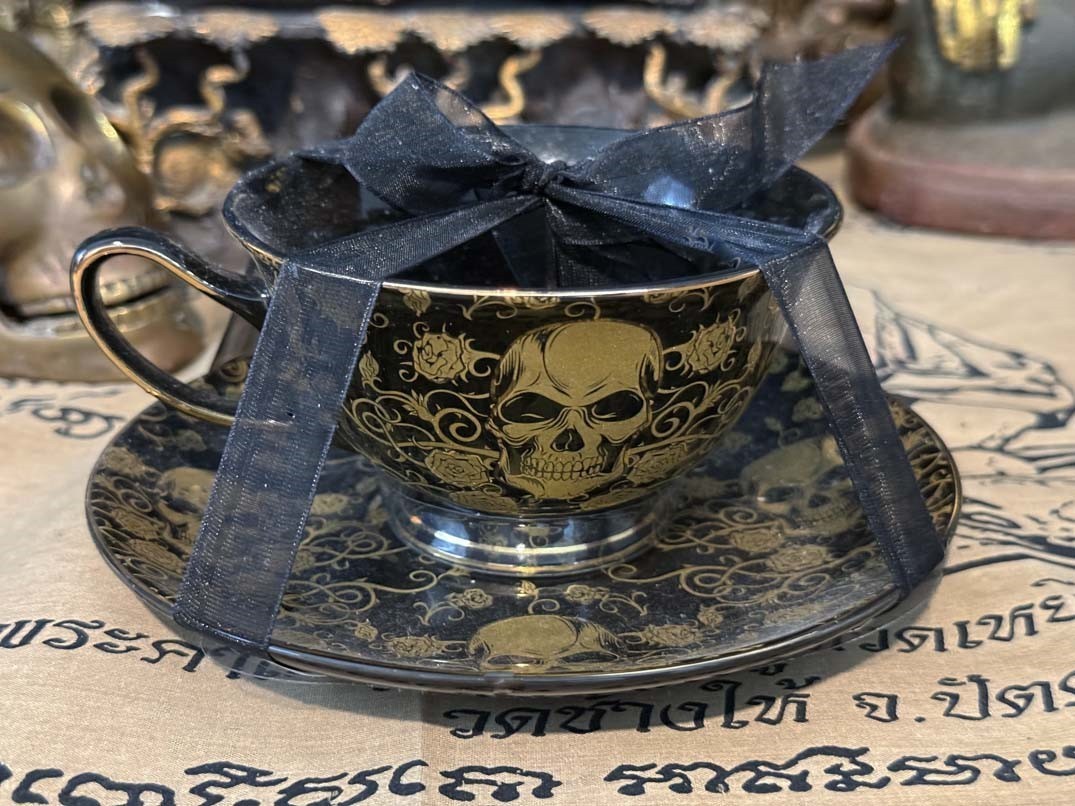 Black and Gold Skull Motif Tea Cup and Saucer Set