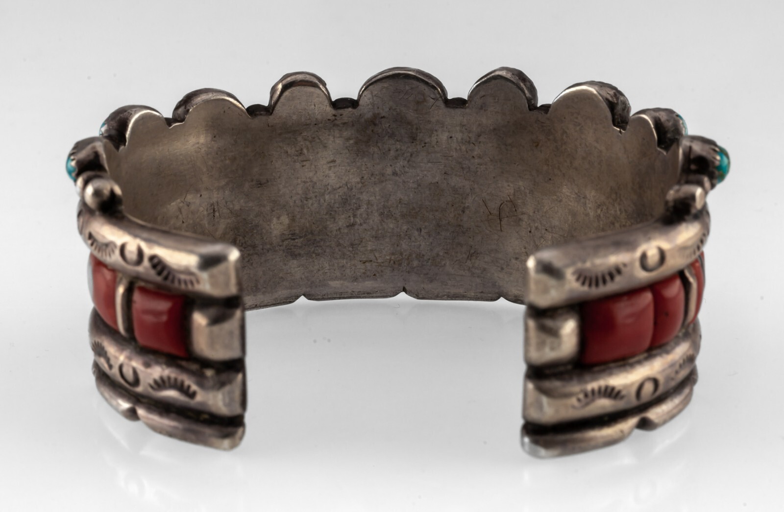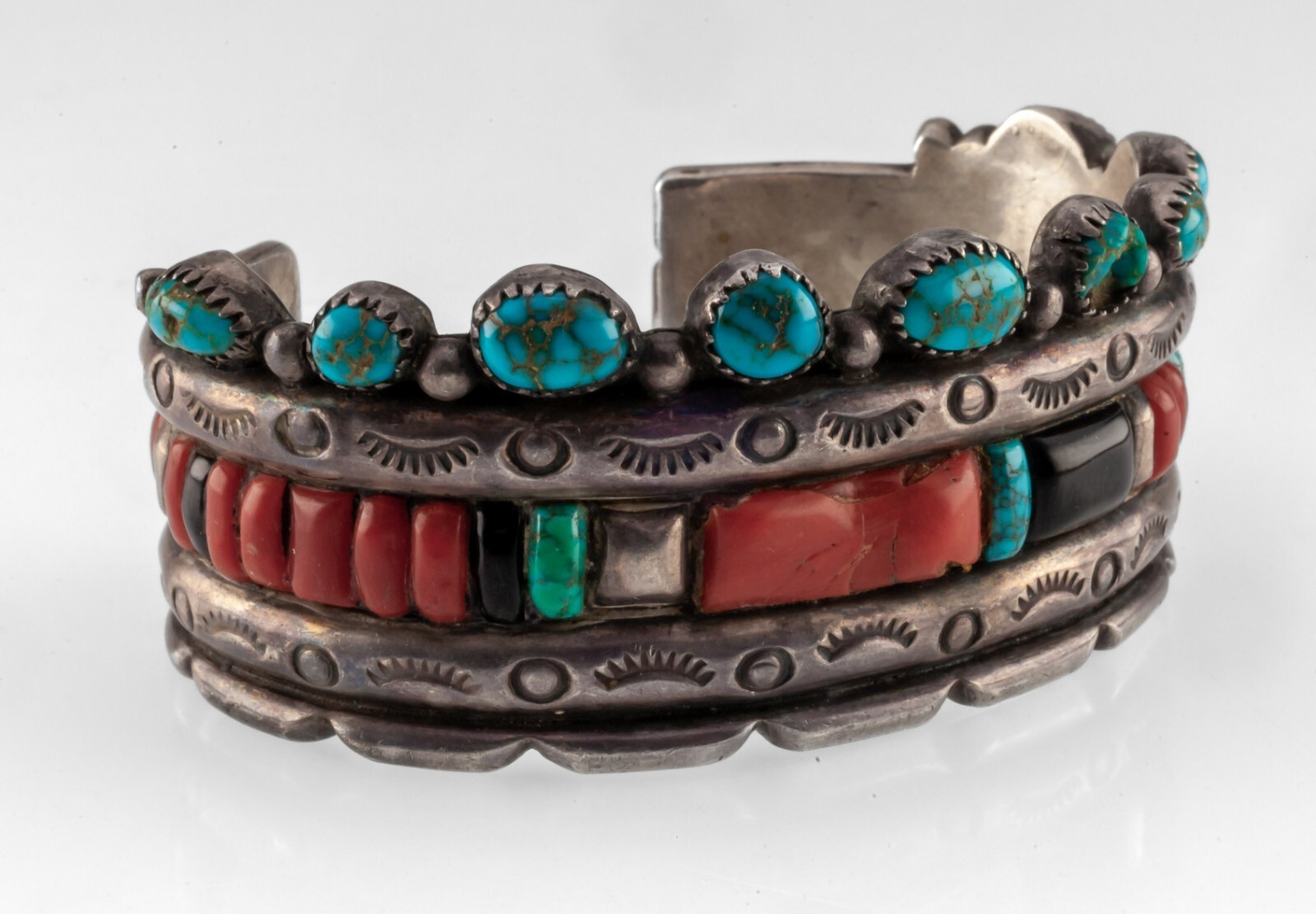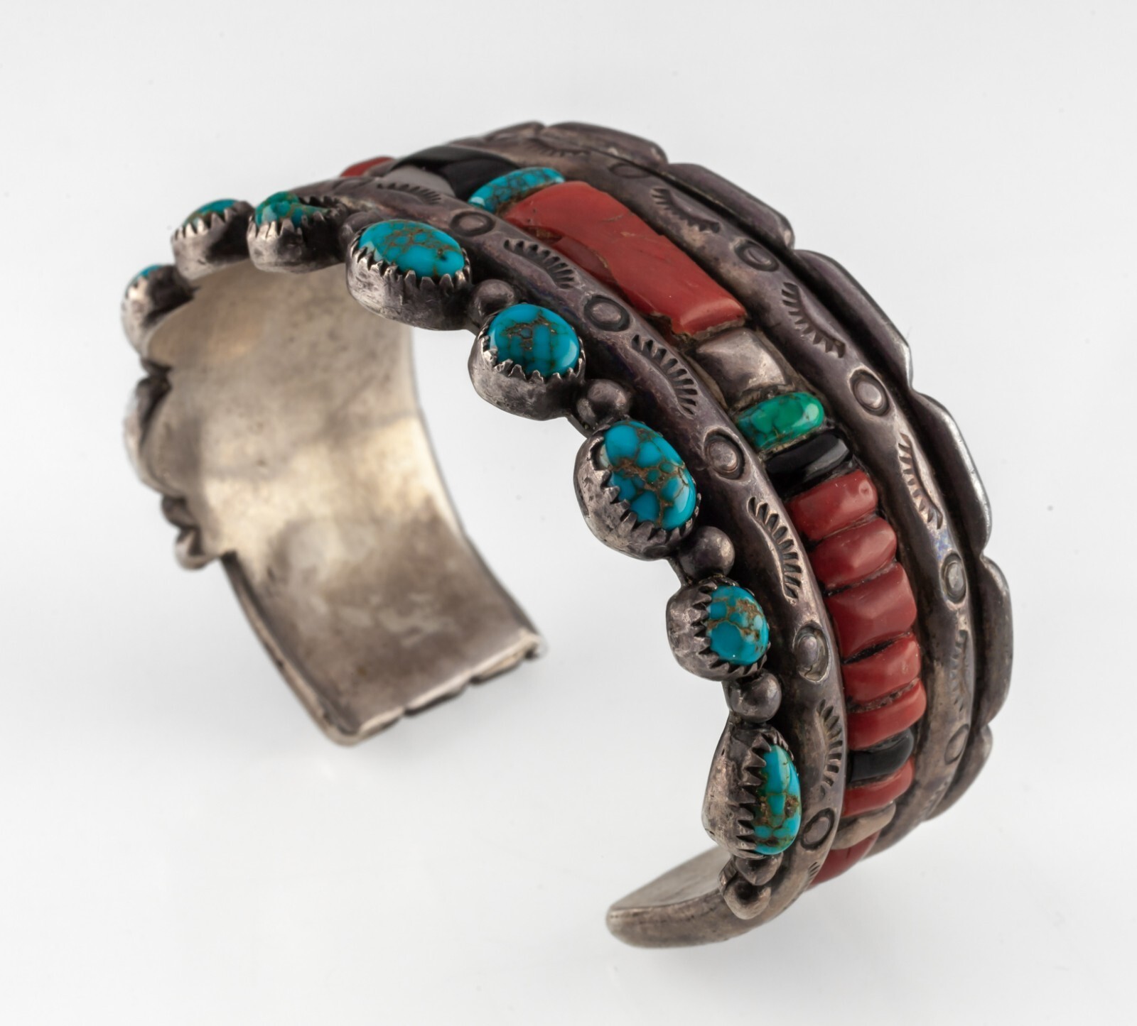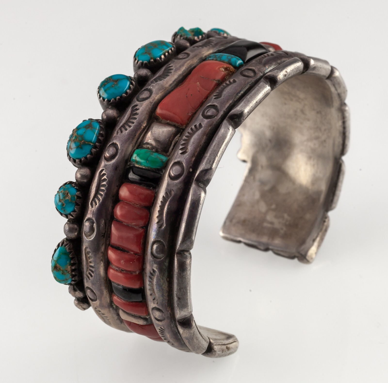 Navajo Ingot Silver Antique Cuff Bracelet w/ Coral, Jet, & Turquoise Inlay 120 g