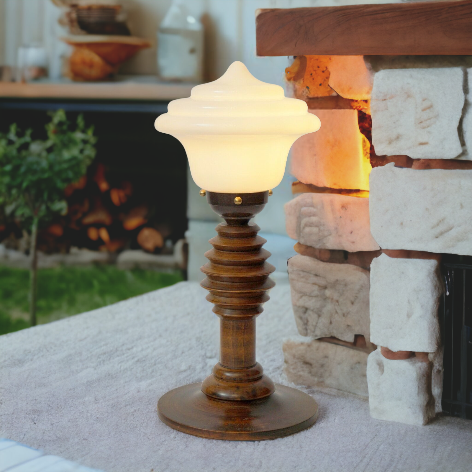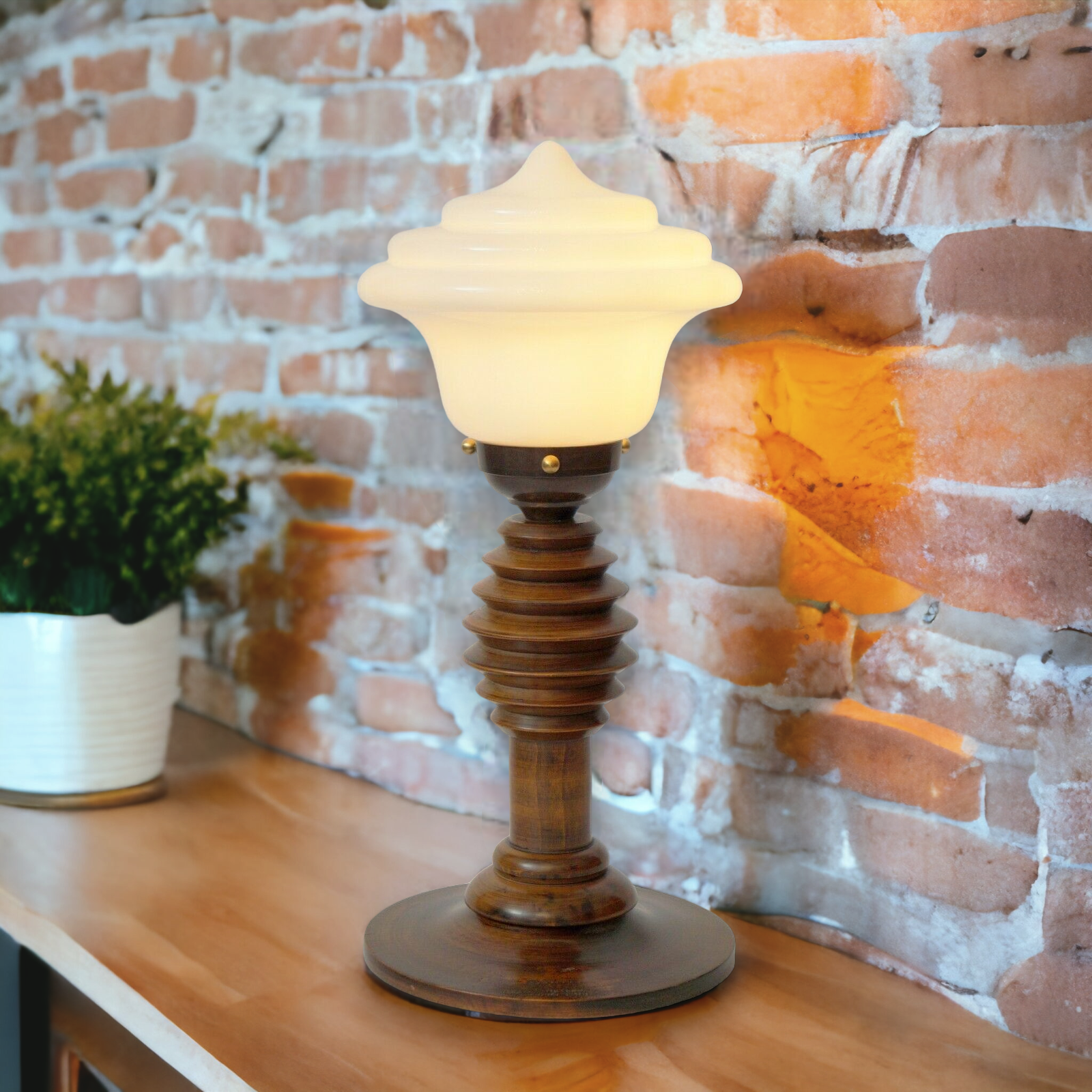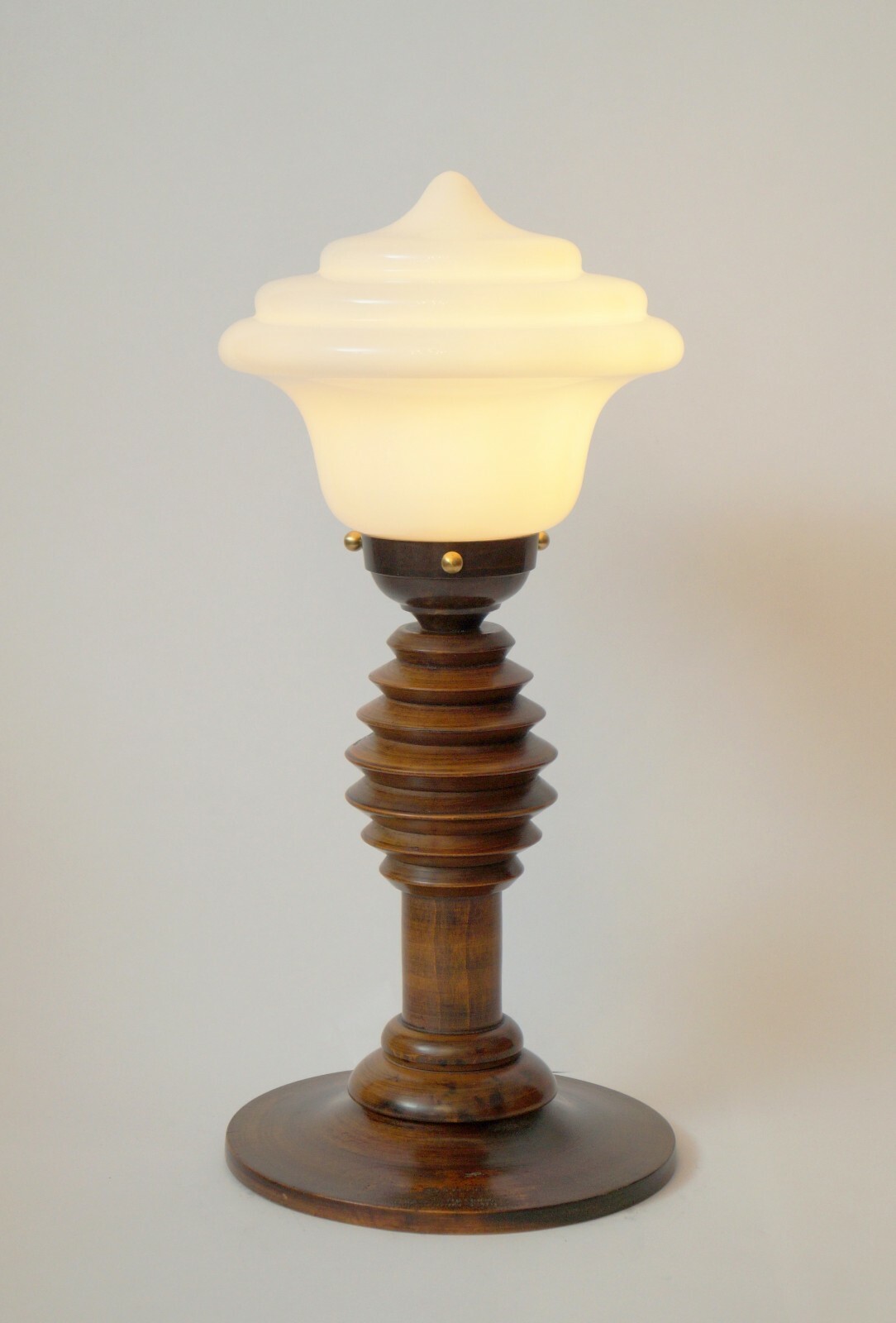 Unique original Art Deco table lamp "Transformer". Art Deco table lamp around 1930. Original mahogany wooden gear with fantastic patina. Very rare, modern art deco lamp glass. Total height approx. 36 cm, umbrella diameter approx. 16 cm. Completely renewed electrical installation. PVC supply line with cord intermediate switch. Antique E27 brass version with porcelain clocks max. 40 watts - we strongly recommend LED lamps! Small parts such as screws or washers have been renewed. Sale without decoration and lamp! Shipping within Germany free of charge!