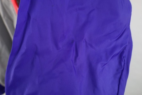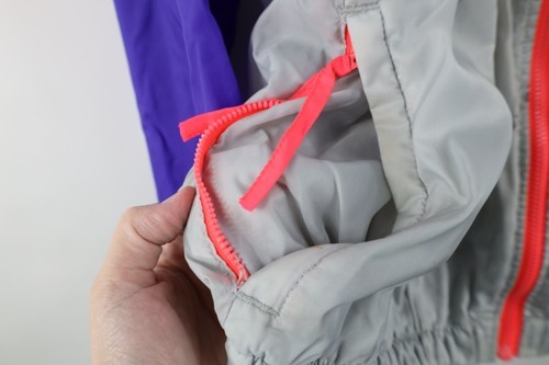Left cuff stretched. Stains throughout. Loose threads inner collar, back. Hood, cuffs discolored. Hood can be zipper into collar. Color faded. String distressed