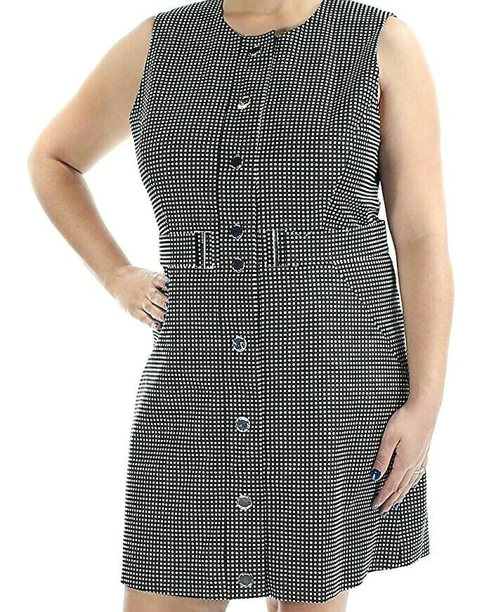 This is for a brand new with tags Michael Kors Black White Checked Snap Button Front Dress Size 14 Embrace designer style with this checked snap front dress! Crafted with a faux self belt and metal hardware, this vintage-inspired piece is sure to turn heads. Show off your signature style in this must-have wardrobe staple. Approximately 33-in. long Front snap closure Split neck Sleeveless Fully lined Sateen fabric Body: cotton, elastane; Lining: polyester, elastane Dry clean only Ships Super Fast Fedex 2nd Day Air to Continental USA street addresses including Alaska and Hawaii. Others use Priority Mail Option.
