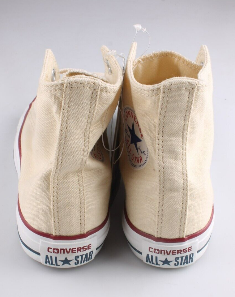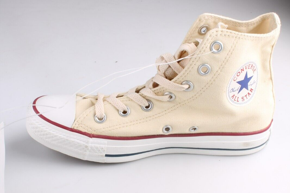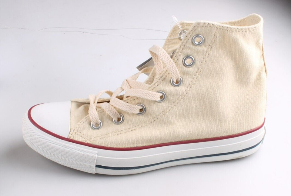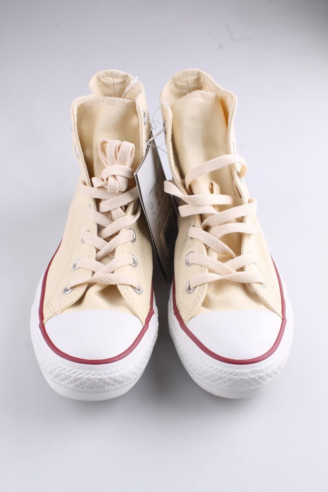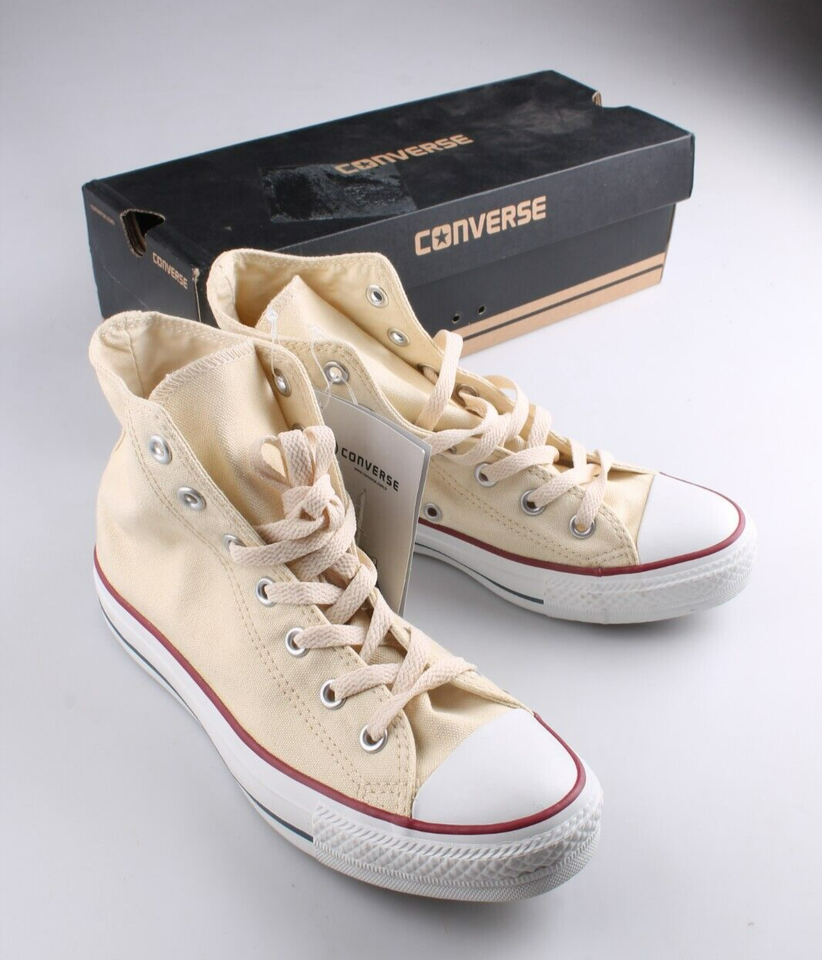 The product is a pair of Converse Chuck Taylor All Star High Top shoes in beige/white. Brand New in box! They are unisex in men's size 5 or women's size 7. The style code is part of the Converse Chucks All Star Chuck Taylor product line. These sneakers feature the iconic Converse branding and are designed for athletic use.