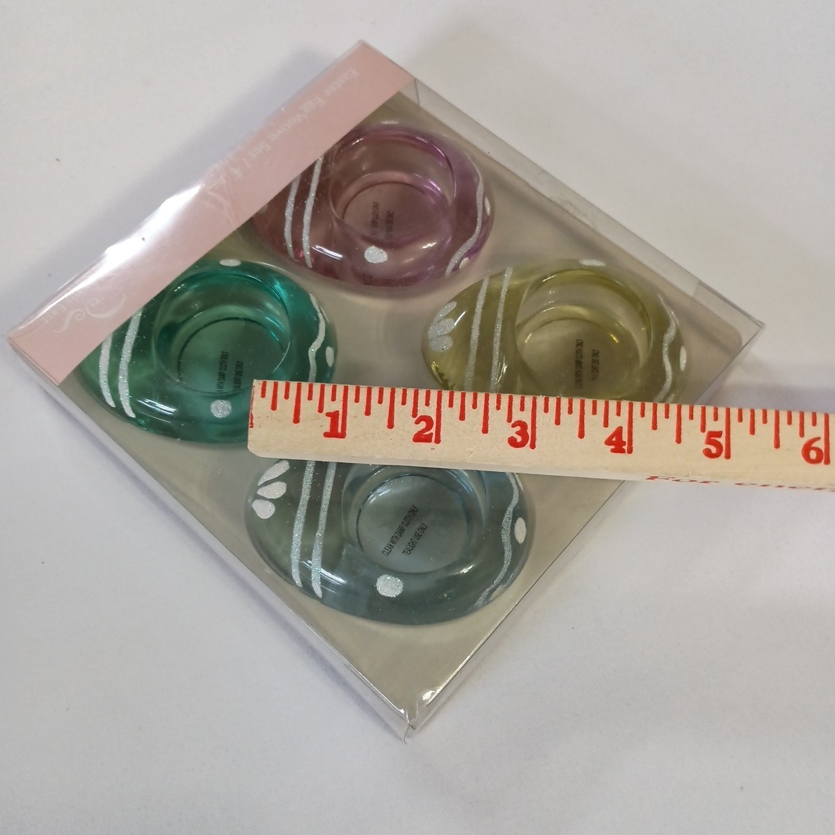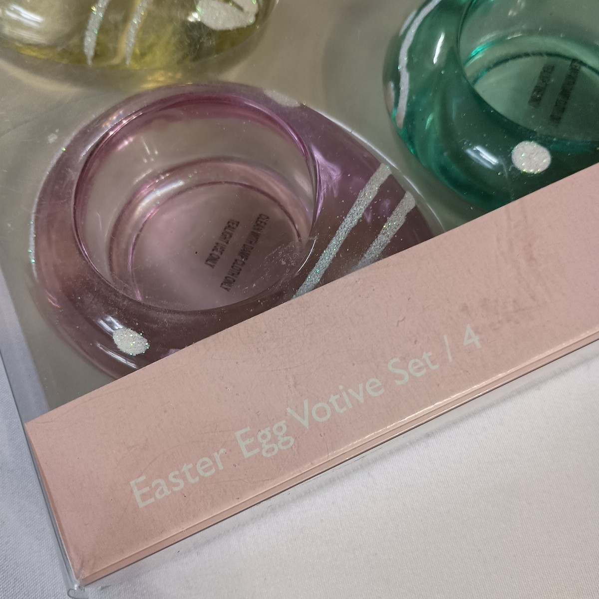 The product is a set of 4 multi-color glass Easter egg votive candle holders by Dennis East International. These holders are suitable for votive candles and tea lights, and can be placed in any room as they are free-standing. The Easter theme and egg shape make them a festive and decorative addition to your home during the holiday season. Perfect for adding a touch of color and light to your space, these holders are a stylish choice for Easter celebrations.New open box.