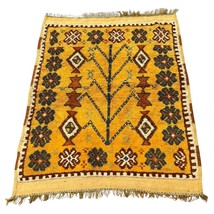 A Highly Decorative Berber AccentThis highly decorative and expressive antique Moroccan Berber accent rug was hand-knotted around the 1930s. It is a vibrant example of tribal artistry, characterized by its playful geometry and richly saturated color palette. A Brilliant and Sunny FieldThe central field features a brilliant sunny yellow, or mustard, hue. This vibrant color instantly brightens and warms any space. It provides a stunning backdrop for the intricate motifs woven upon it. A Stylized Tree of Life MotifThe field is adorned with a stylized, abstracted Tree of Life motif. This central symbol is rendered in a deep, contrasting indigo blue. It is flanked by geometric tribal symbols including diamonds and quatrefoils. Rich Borders and Luxurious TextureThe entire composition is surrounded by a visually rich triple border. This frame enhances the rug's graphic impact. Hand-woven from soft, shaggy wool, the rug offers a thick and luxurious pile underfoot. A Perfect Bohemian StatementIts size makes it a perfect statement piece for modern interiors. Use it as a focal point under an armchair or in a cozy reading nook. It brings authentic bohemian character to any living space. Key Product DetailsPrice is for This single rugStyle Antique Moroccan Berber (Tribal)Period Mid-20th Century, circa 1930sOrigin MoroccoCondition Good Vintage ConditionMaterial Hand-Knotted WoolDimensions 3 ft 4 in x 4 ft 1 inDimensions (Metric) 102 cm x 124 cmPrimary Colors Sunny Yellow, Teal, Brown