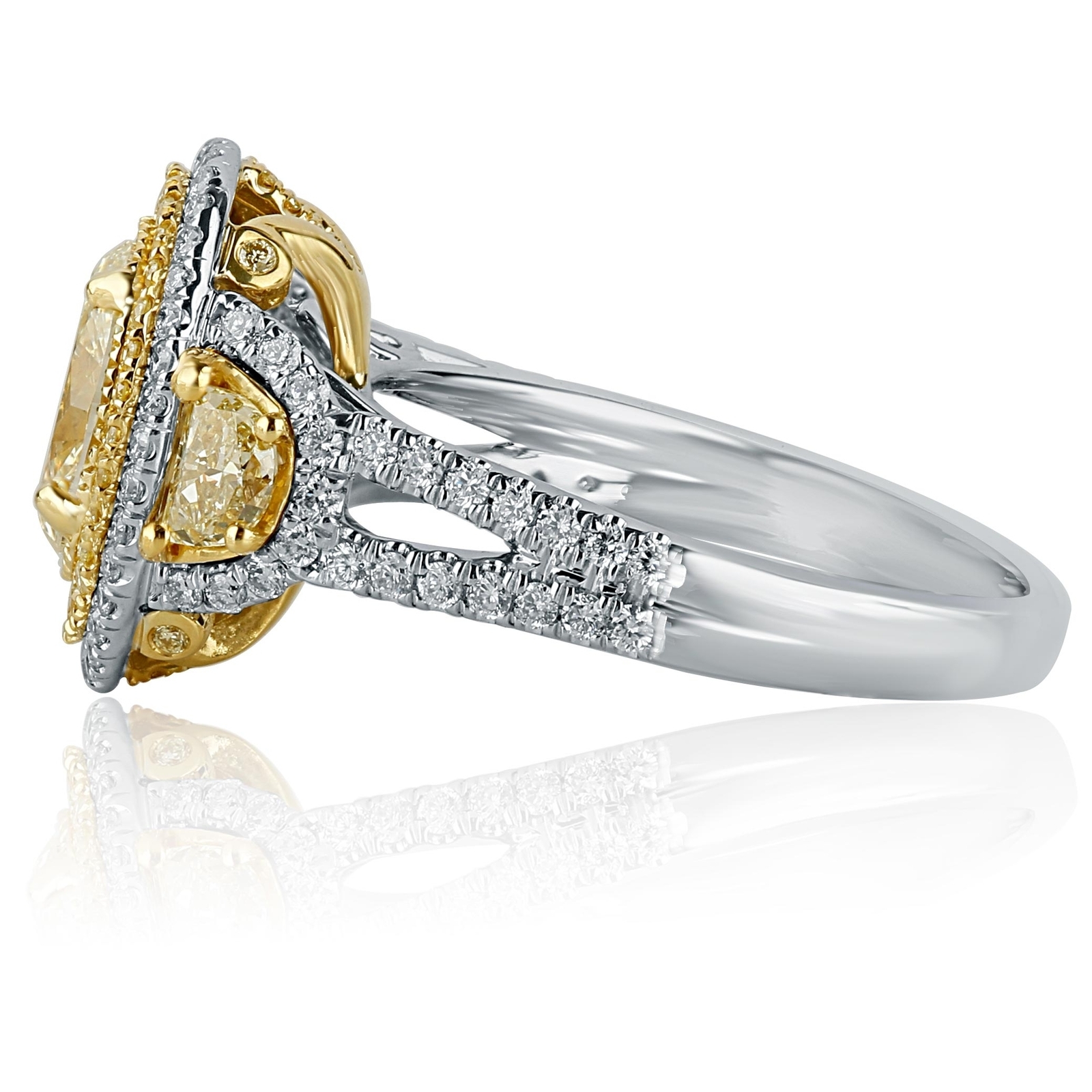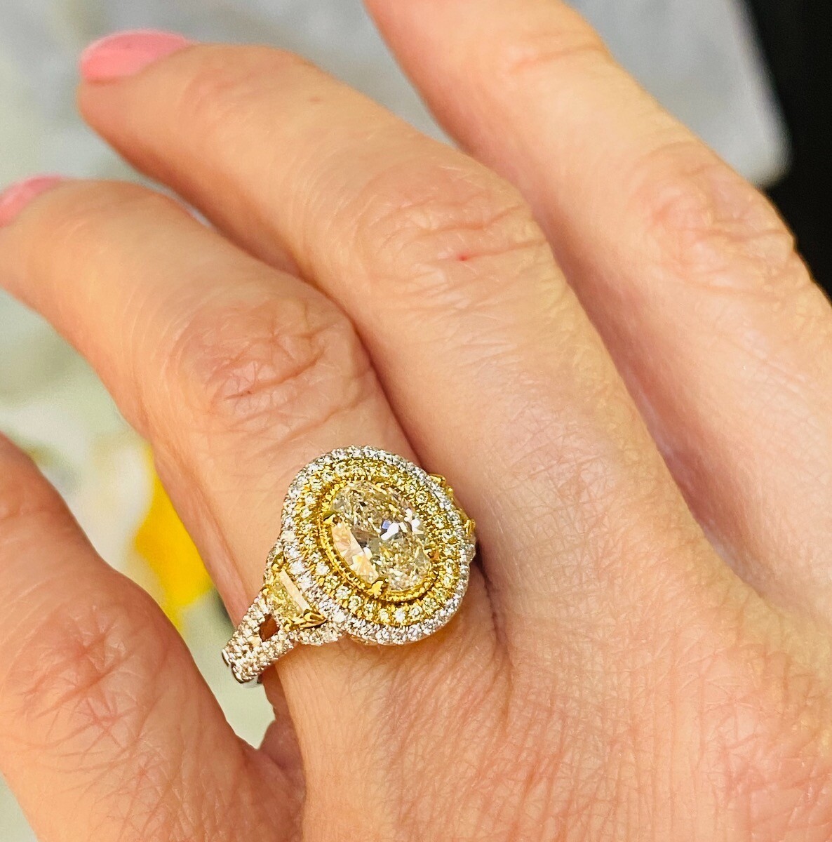 Anneau de fiancailles exquise presentant un diamant central ovale jaune tres clair de 1,01 carat de 1,01 diamant de la moitie du cote jaune. Le double halo avec des diamants rond incolores et jaunes et une tige divisee completent un design. Fabrique a la main en or multi-ton de 18 karats. Le poids total des carats est de 2,13 carats.