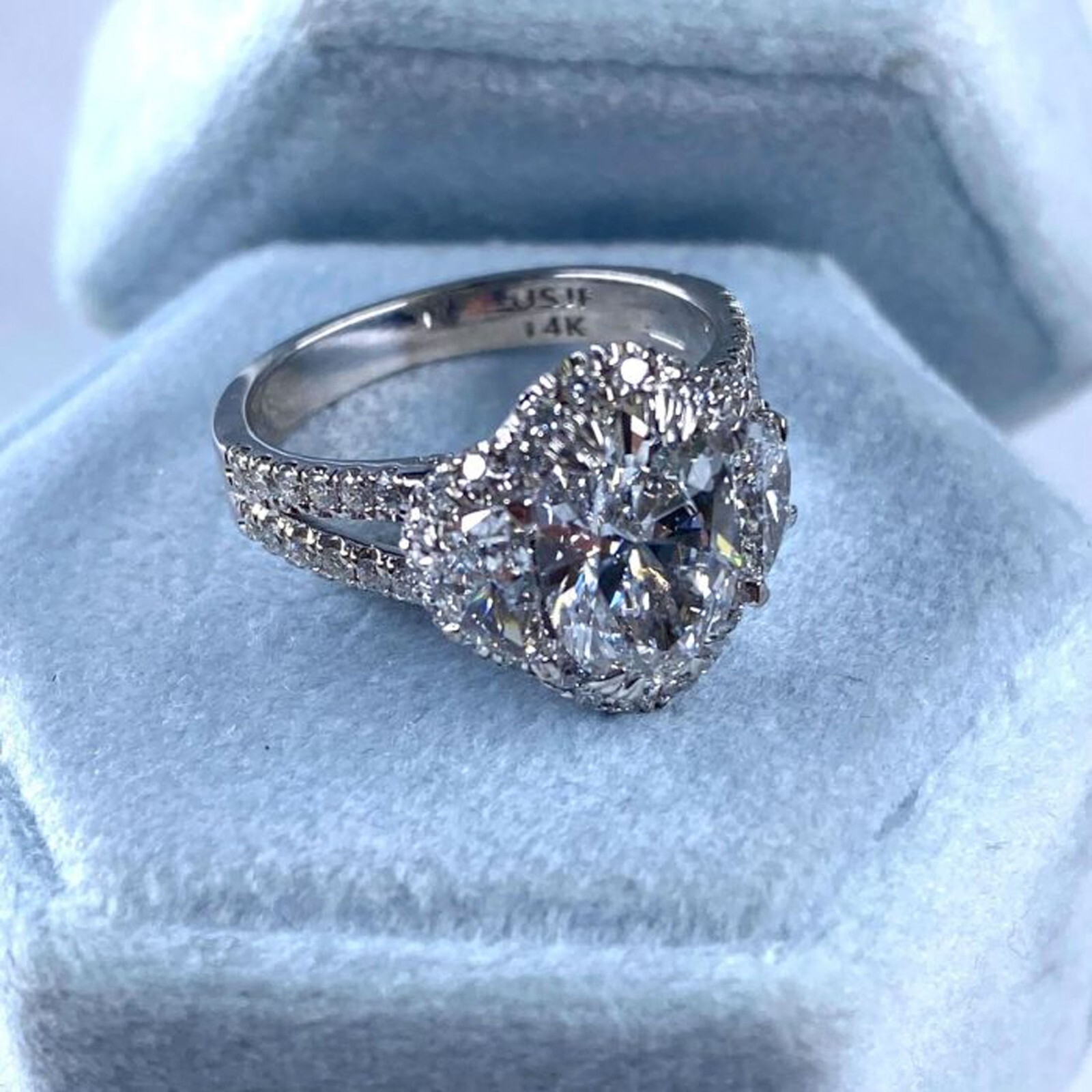 Cette bague de fiancailles etincelante possede un magnifique diamant cultive en laboratoire de laboratoire brillant OVAL CLIAL IGI en son centre !! En entourant la pierre centrale, un halo de laboratoire a ete cultive et sur le cote 0,78 carat e / si demi-lunes Lab Lab Lab Diamonds, ce qui ajoute une touche de glamour et de romance a l'anneau !! Fabrique en or blanc 14 carats. Le poids total des carats est de 3,70 carats.