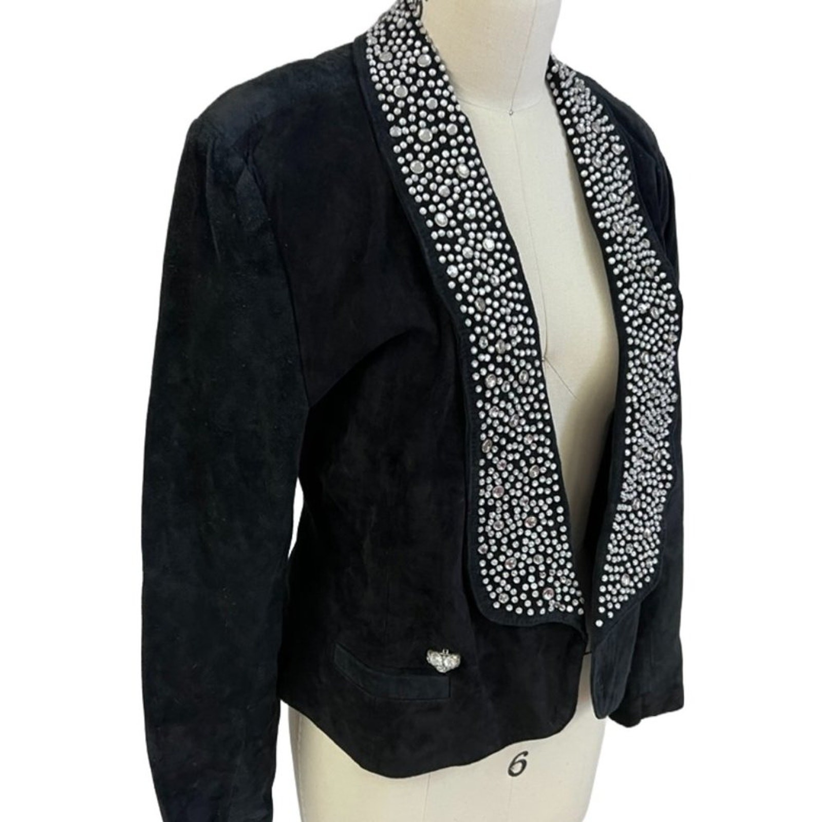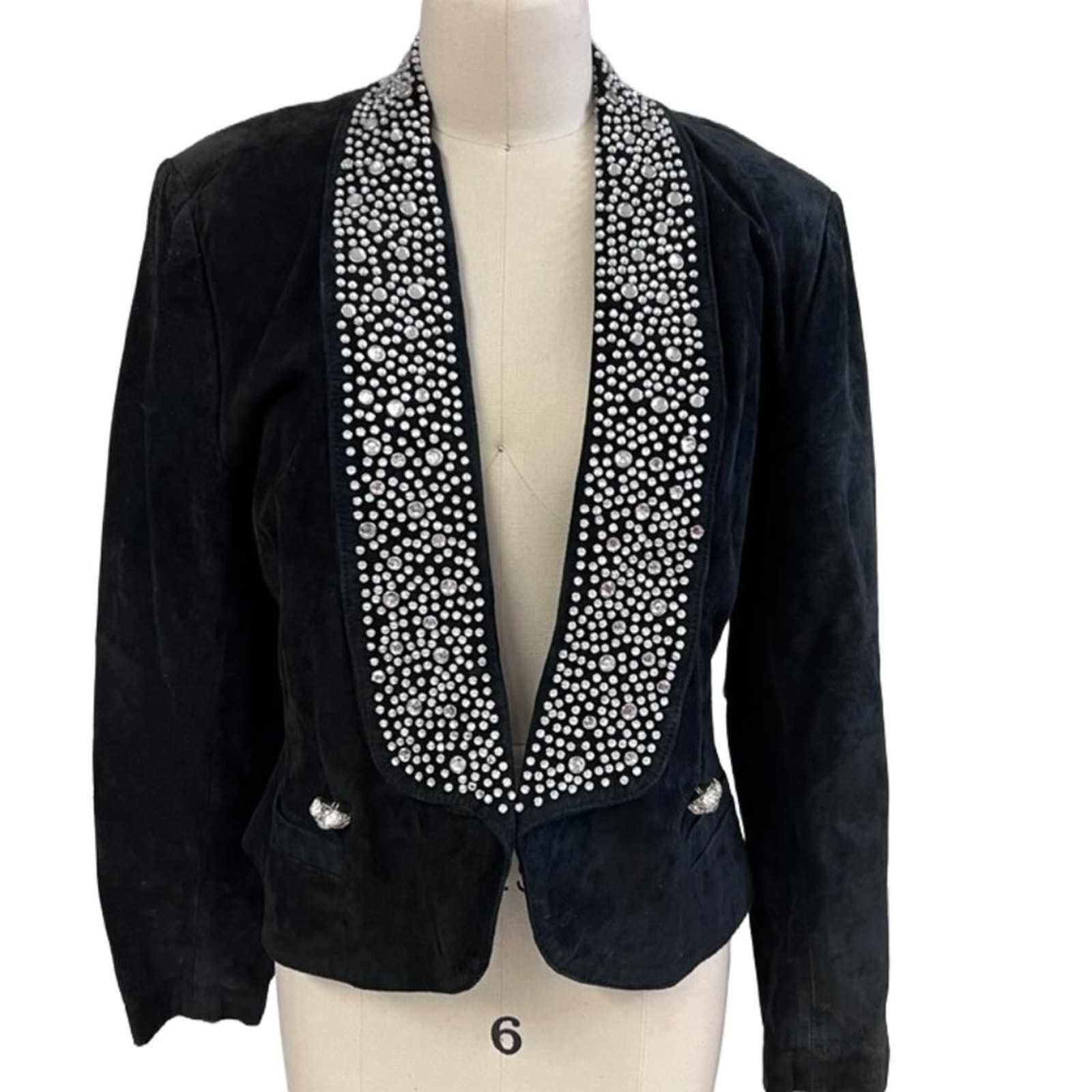 VTG 80s Lillie Rubin Black Suede Studded Rhinestone Pearl Blazer Jacket Sz 8