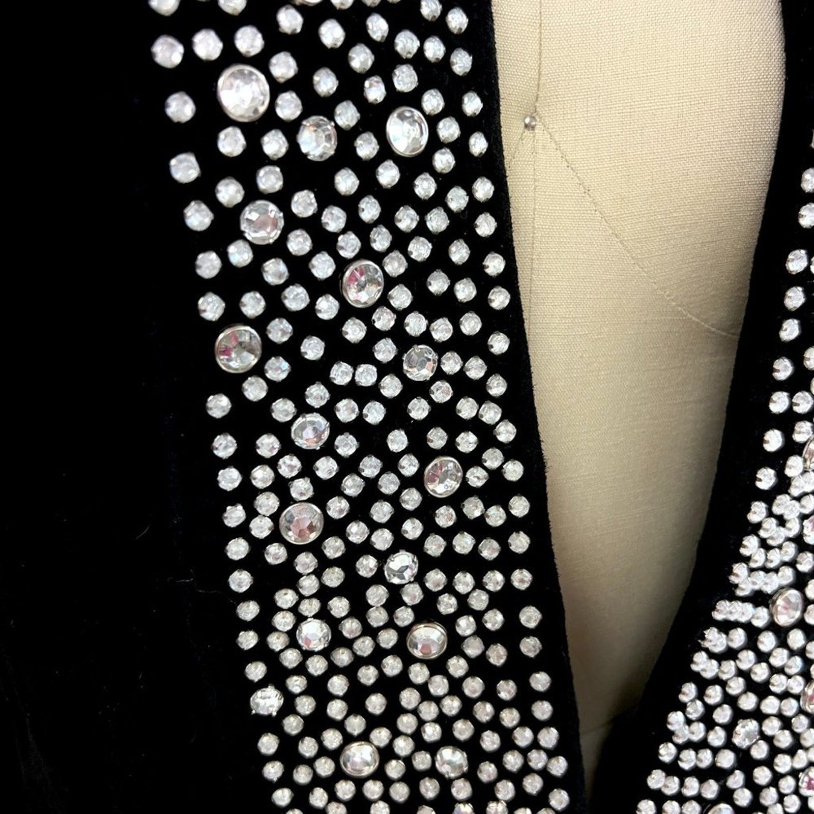 Vintage Lillie Rubin women?s blazer in genuine black suede leather, cropped cut. The dramatic shawl collar is fully encrusted with silver studs, rhinestones, and pearls for maximum 1980s glam. A bold evening piece that embodies the era?s statement dressing ? luxury, sparkle, and confidence.