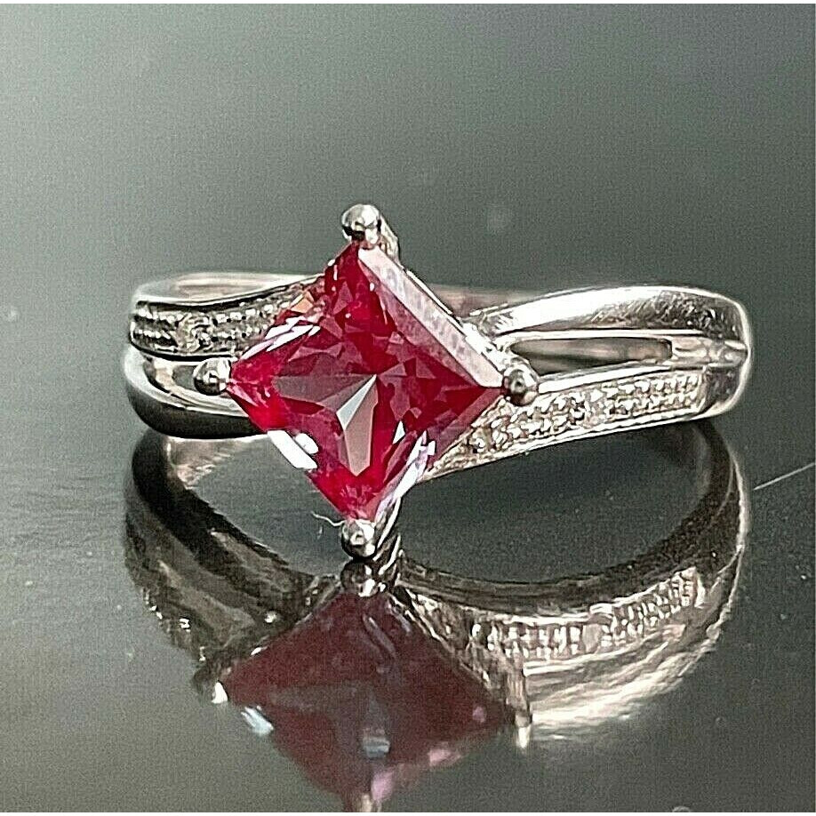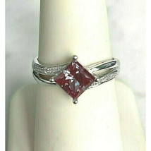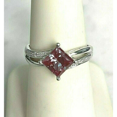SIZE 7.THE RING FEATURES 6 x 6 mm MYSTIC TOPAZ,FURTHER ACCENTED WITH 2 SMALL ROUND CUT DIAMONDS.I CAN NOT DESCRIBE THE COLOR OF TOPAZ,IT VARIES UNDER DIFFERENT ANGLES.WEIGHT:2.7 GRAMS.