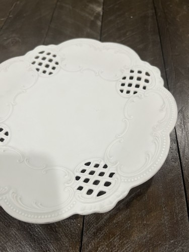 This vintage plate from Tirschenreuth, Bavaria, Germany showcases a beautiful open lace pattern on a round, scalloped design. The plate measures 8 inches in diameter and is made of high-quality porcelain. Its classic white color and vintage charm make it a great addition to any collection.