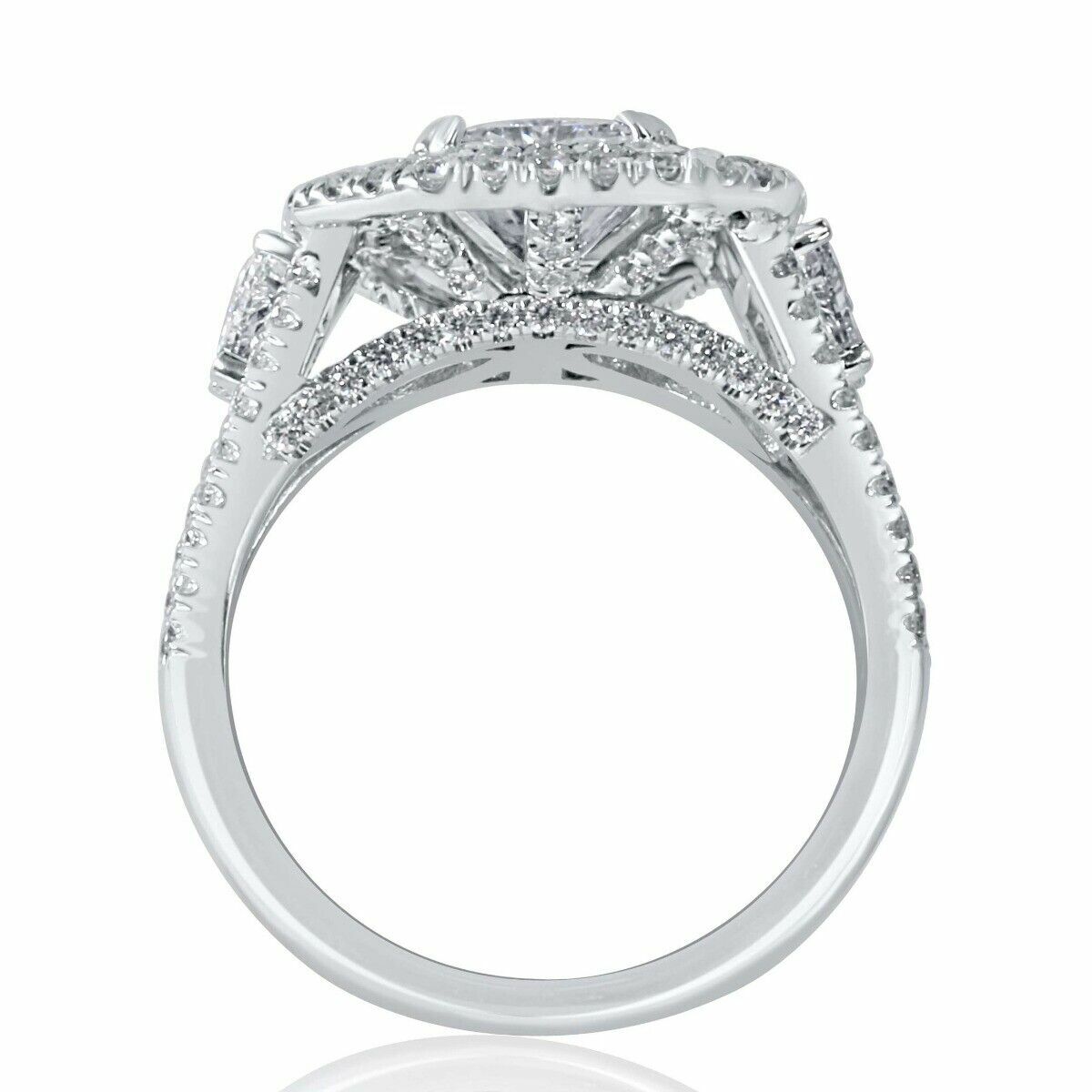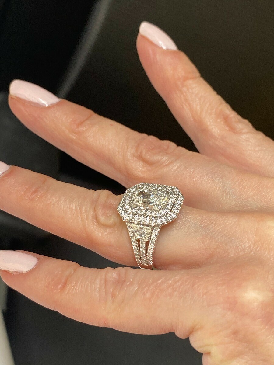 Este impresionante anillo de compromiso cuenta con un magnífico diamante de laboratorio de corte radiante de 2.06 quilates en su centro. ¡Alrededor de la piedra central hay un doble halo de cortes redondos cultivados en laboratorio y en el lado billones de diamantes cultivados en laboratorio, lo que agrega un toque de glamour y romance al anillo! Hecho a mano en oro blanco de 14k. El peso total de quilates es de 4.02 quilates.