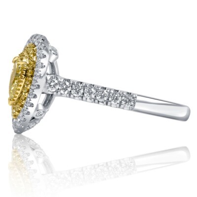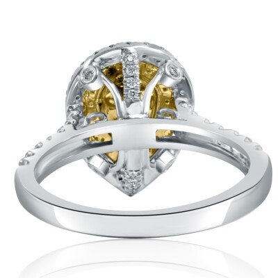 Questo bellissimo anello unico nel suo genere mette in mostra un diamante giallo naturale a pera certificato da 0,53 carati alla pera gialla naturale a taglio naturale circondato da un doppio alone di diamanti incolori e gialli a taglio rotondo e scintillante in ambientazione di micro pavimentazione. Ulteriori diamanti continuano lungo il gambo e i dettagli della galleria, creando un aspetto scintillante di questo anello. Realizzato a mano in oro bicolore da 18 carati e completato con una finitura polacca elevata. Il peso totale dei carati e di 1,22 carati.
