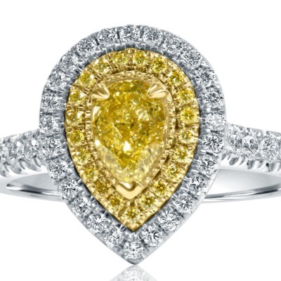 Questo bellissimo anello unico nel suo genere mette in mostra un diamante giallo naturale a pera certificato da 0,53 carati alla pera gialla naturale a taglio naturale circondato da un doppio alone di diamanti incolori e gialli a taglio rotondo e scintillante in ambientazione di micro pavimentazione. Ulteriori diamanti continuano lungo il gambo e i dettagli della galleria, creando un aspetto scintillante di questo anello. Realizzato a mano in oro bicolore da 18 carati e completato con una finitura polacca elevata. Il peso totale dei carati e di 1,22 carati. I nostri prodotti sono tutti realizzati a mano con qualita e cura, nel cuore del Diamond District in 47th Street a New York City. La nostra dedizione e impegno per il lavoro e la qualita eccezionali superano tutti gli altri. Poiche tutt