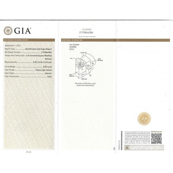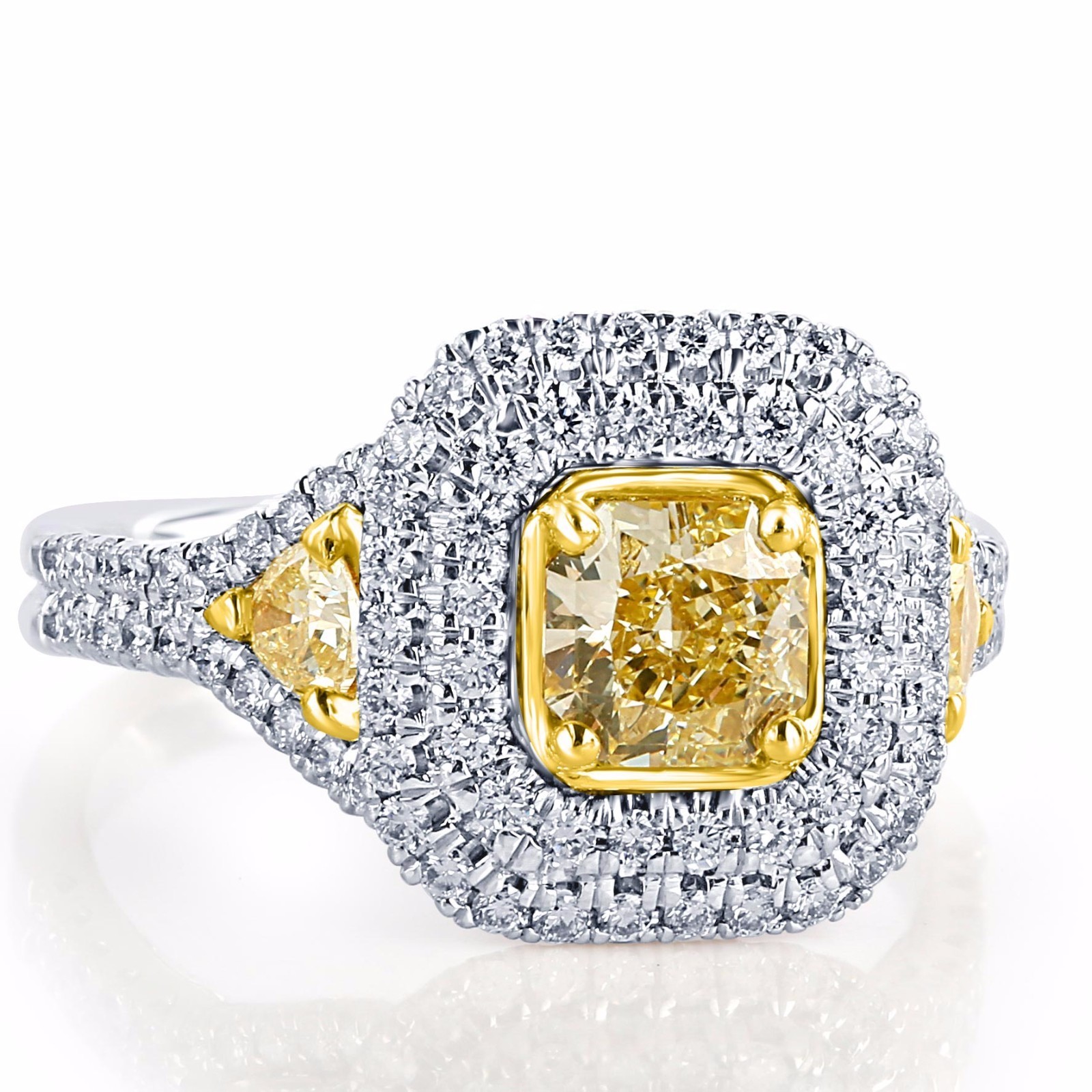 Questo bellissimo anello di fidanzamento con diamante certificato Gia a gia giallo chiaro radiante in un doppio alone incrostata in diamanti a taglio rotondo contrastante, su ogni lato c'e un diamante tagliato a trilioni di trilioni giallo chiaro naturale.
