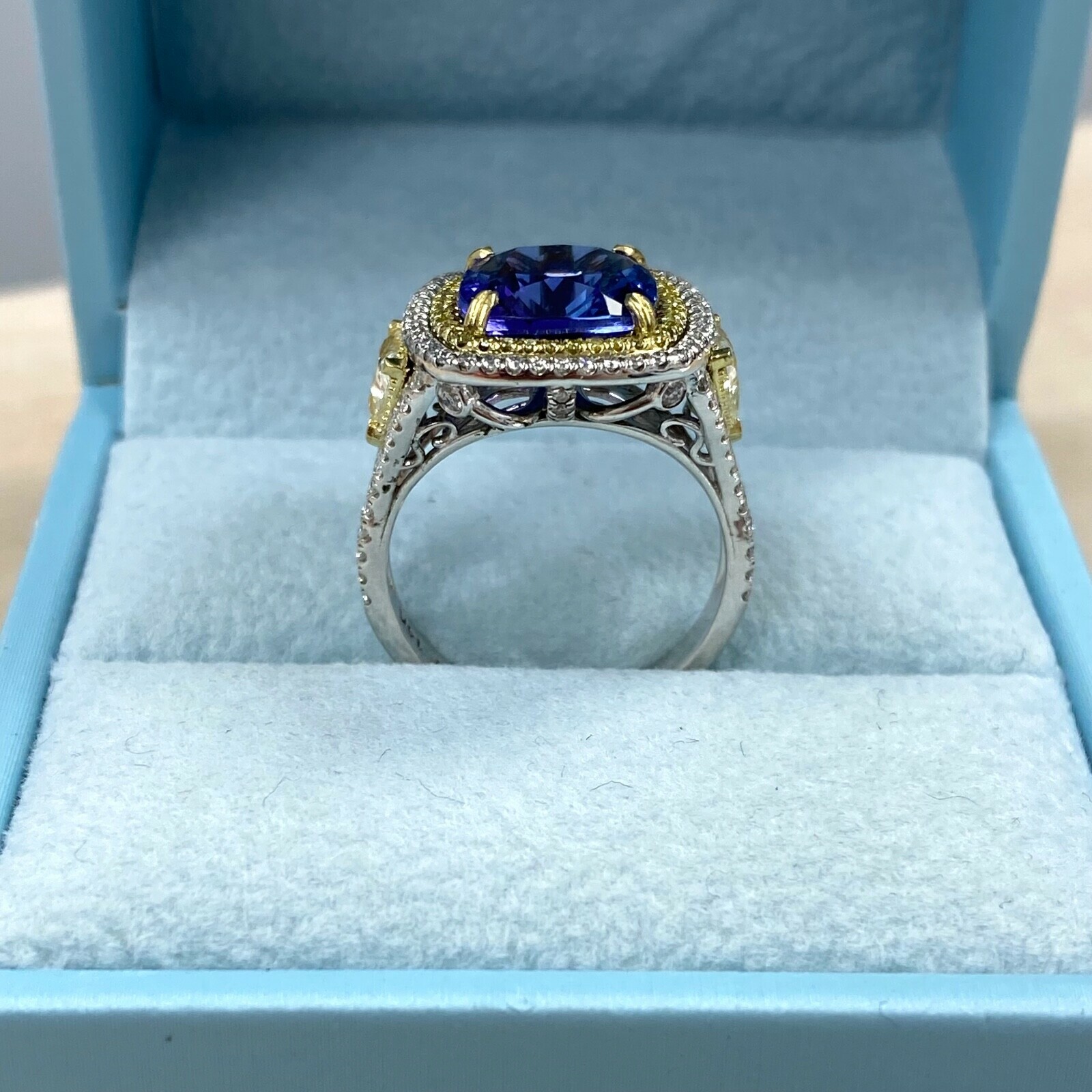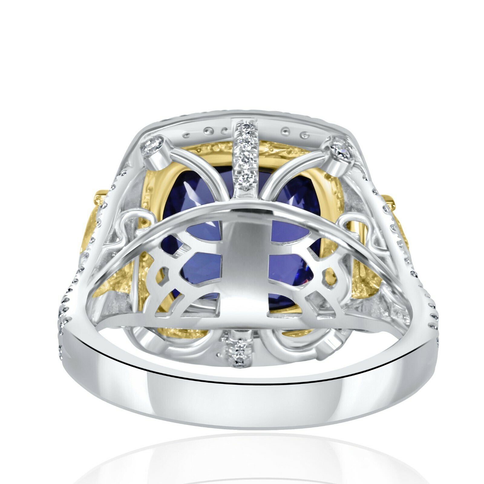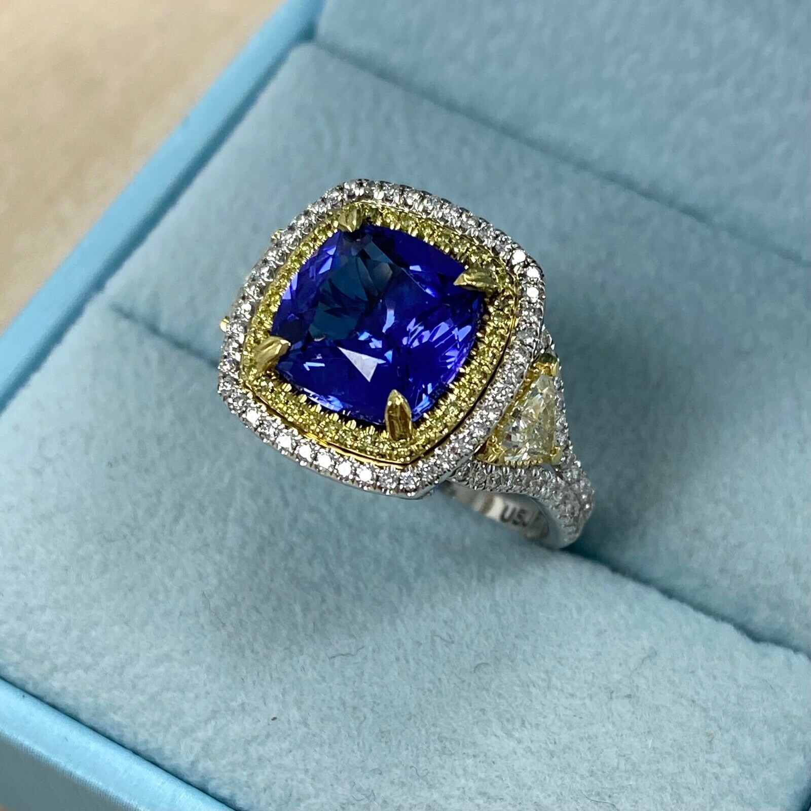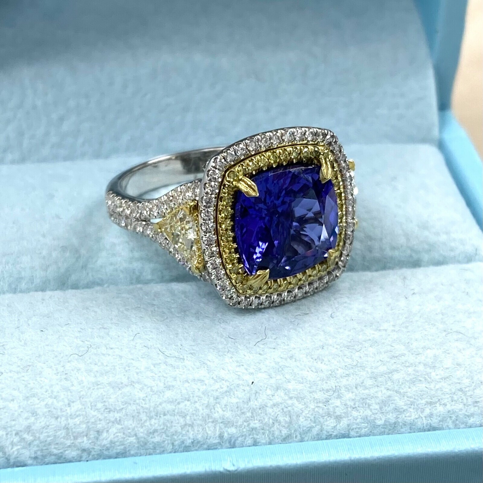 Questo anello e semplicemente sbalorditivo, irradiante eleganza senza tempo. E dotato di una tanzanite blu-violetta tagliata a cuscino da 4.15 al centro, circondato da un doppio alone di diamanti tagli rotondi gialli e bianchi che lo fanno brillare ancora più luminoso. Sul lato, ci sono trilioni di diamanti tagliati che aggiungono un tocco in più di raffinatezza. Realizzati con oro bicolore 14K, i piccoli diamanti sono delicatamente posizionati sotto la galleria, dandogli una finitura graziosa e raffinata.