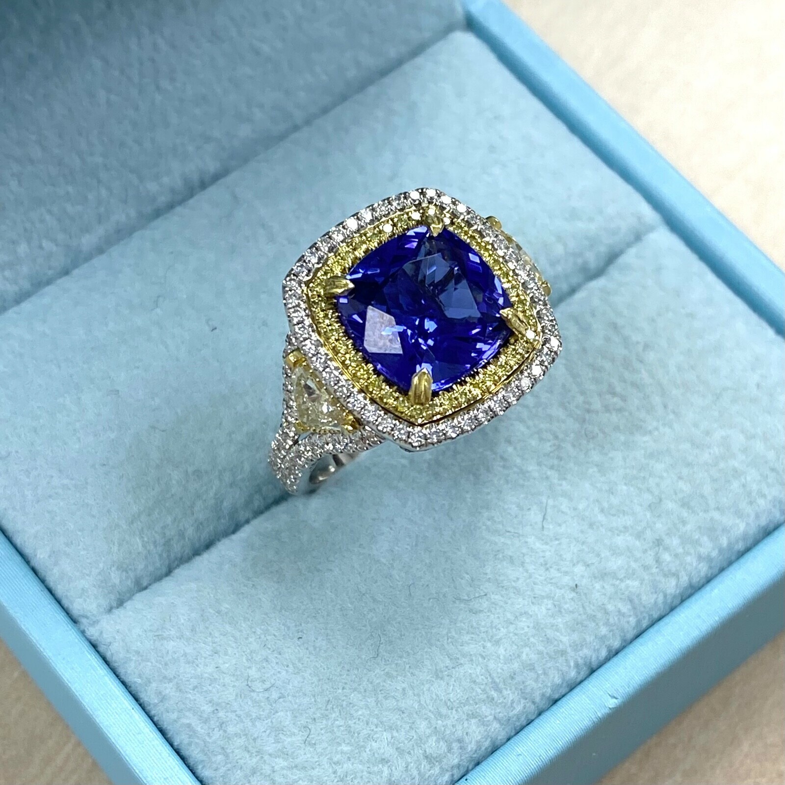 GIA 4.15 KT Blu Violetto Taglio Cushion Tanzanite Anello Diamante 14k Oro 5.70