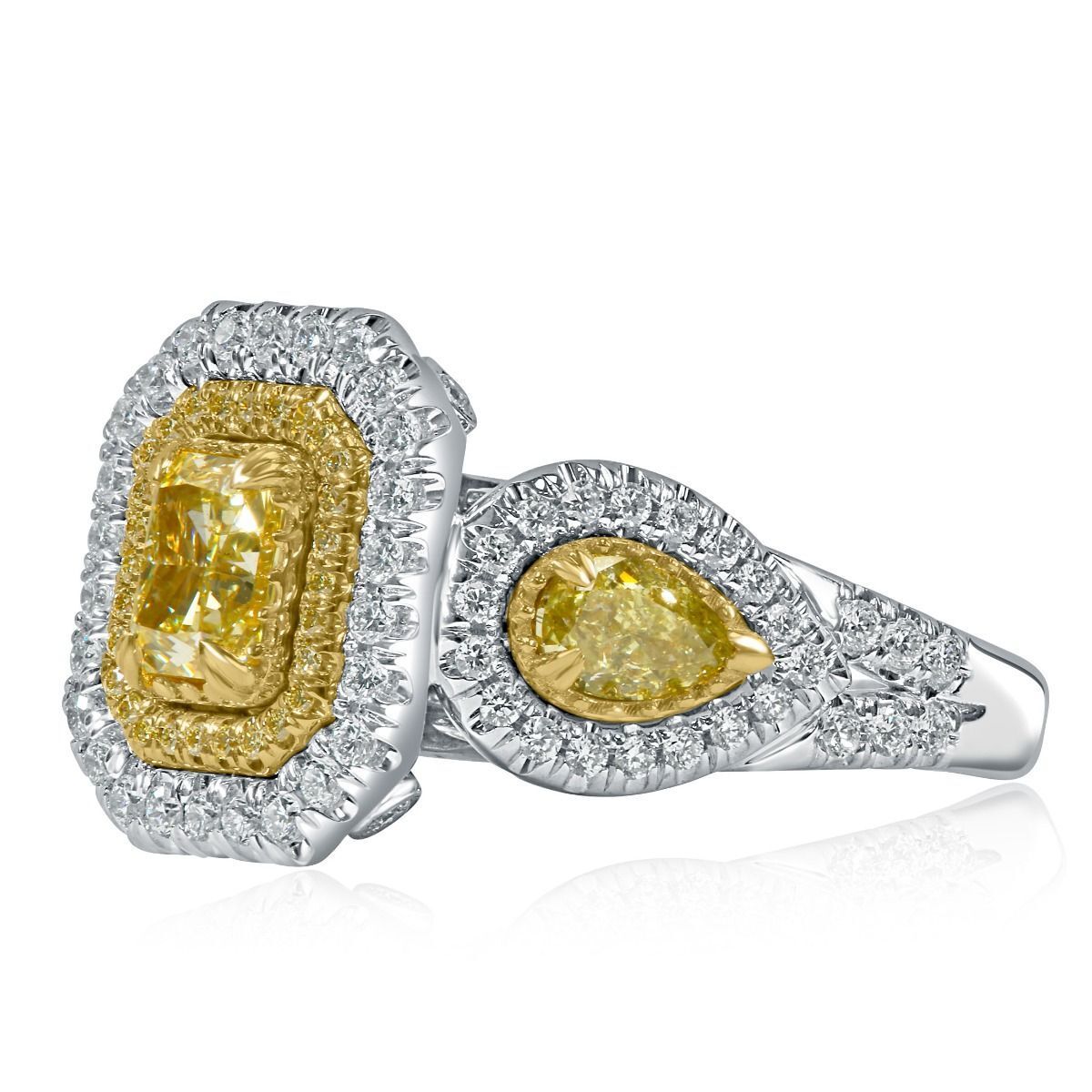 L'anello di fidanzamento di diamanti elegante presenta un diamante giallo naturale radiante certificato GIA da 0,73 carati che ha abbracciato da due diamanti il ??lato giallo fantasia a due tagli a pera. Il diamante centrale e circondato da una cornice alone con accenti di diamante a taglio rotondo incolore e giallo. Ulteriori diamanti fiancheggiano il gambo e la galleria, completando l'aspetto brillante di questo anello. Fraticato a mano in oro bianco, giallo bianco e rifinito con polacco alto. Il peso totale dei carati e di 2,06 carati.