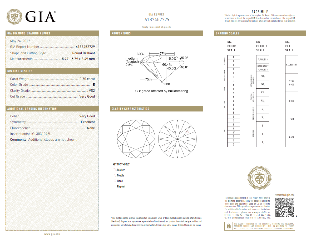 0.70 Carat Loose E / VS2 Round Brilliant Cut Diamond GIA Certified Diamond General Info GIA Report Number: 6187452729 Diamond Cut: Round Brilliant Measurements: 5.79 x 5.77 - 3.49 mm Diamond Grading Results Carat Weight:0.70 Color Grade: E Clarity Grade: VS2 Additional Grading Information Polish: Very Good Symmetry: Excellent Fluorescence: None Cut Grade: Very Good This Diamond is guaranteed authentic, non-treated and natural. All items are professionally packaged and shipped. All shipments include insurance and delivery confirmation or signature confirmation. Local Pick-up is available in our showroom. (Contact us for payment methods to pay on pickup.) California Buyers: 9.5% sales tax will be added. Returns Policy: About Us: Continental Coin and Jewelry Company Web Department: