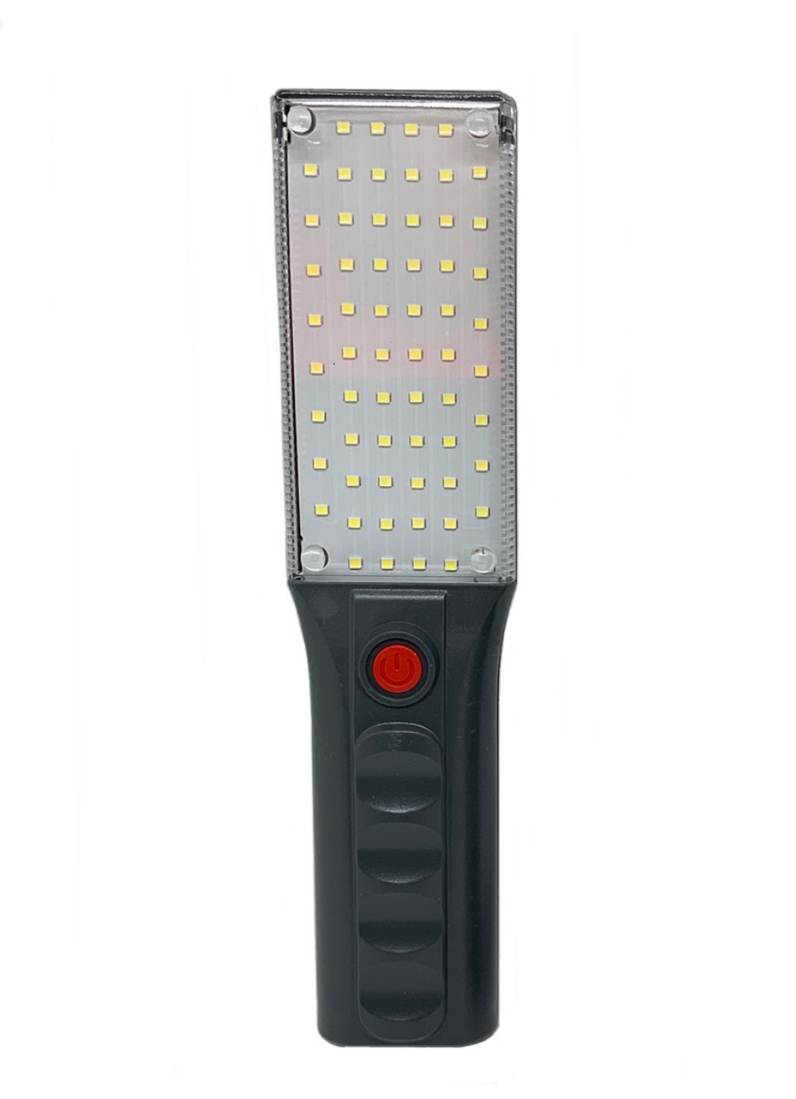 Rechargeable powerful LED work light with integrated hanging hook and dual magnets.