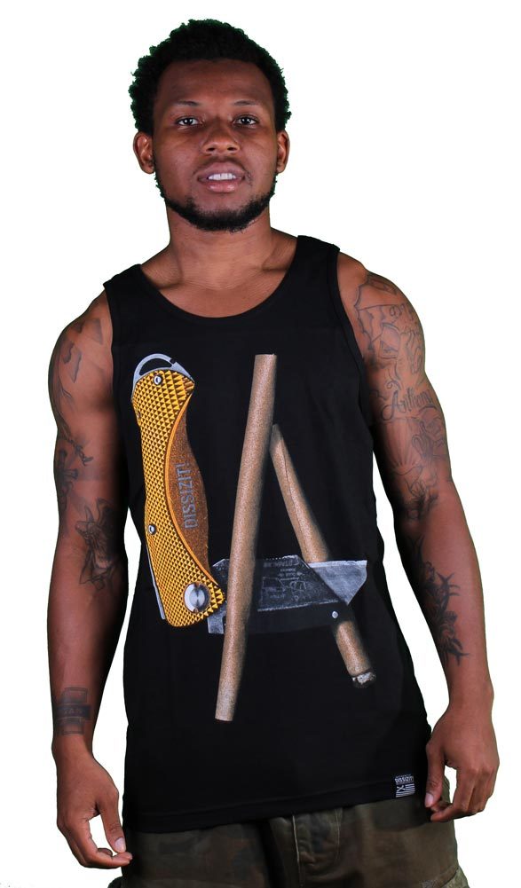 Smoke down in the LA Cutter graphic tank. Creative cutter front graphic includes orange and silver pocket knife and blunts making the LA letters. Color Schemes- Black Or White (see availability) Material- 100% Cotton Style- Graphic Tank Top