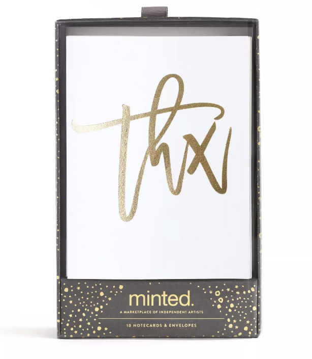 This is for a brand new box of 10ct Minted Joanna Phillips Huuva Lake Zurich IL Thank You Cards w Envelopes Share your gratitude with unique thank you cards designed by Joanna Phillips Huuva, an independent artist from Minted's community. These boxed thank you cards are hand-pressed with real gold foil on luxe cotton paper, feature blank interiors, and include coordinating kraft envelopes. Minted is a design marketplace that uses a unique crowdsourcing platform to connect you to the world's best emerging artists. Artists submit their work, everyone votes, and Minted turns the winning designs into beautiful products. Artwork by Joanna Phillips Huuva from Lake Zurich, Illinois Includes 10 folded cards with kraft envelopes Paper type: luxe cotton paper - 0.42mm/275gsm Dimensions (Overall): 7