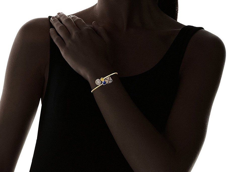 This is for a brand new Blossom Box Gold Tone Lemon Quartz/Lapis Adjustable Bangle Bracelet Stones: Lemon Quartz, Blue Lapis Lazuli and Cubic Zirconia on the circle and Pyramid Length 7" Adjustable