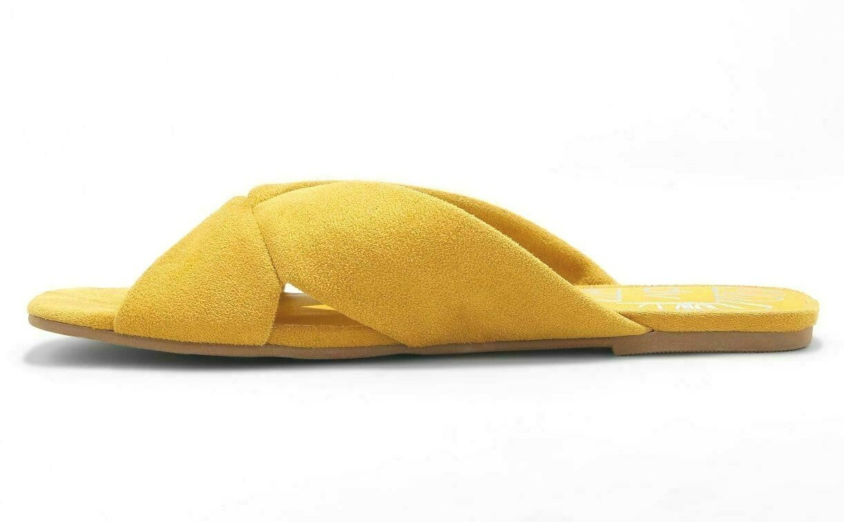 This is for a brand new pair of Women's dv Yellow Addie Microsuede Knotted Slide Sandals Fit style No heel Cross band flat sandal with twist band detailing Slip on for easy on and off Faux suede "Knotty" meets nice with the dv Addie Slide Sandal. Slip into one of the season's hottest designs with its soft faux suede and retro knotted upper. Pair with your favorite mumu for a day by the pool or with tailored pants and loose blouse for a day out in the city. Sizing: Women Care and Cleaning: Wipe with damp cloth Lining Material: Polyester Insole Material: Polyurethane Features: Instep strap, Slip on, Open toe Upper Shoe Material: 100% Polyester Sole Material: 55% Polyester and 45% TPR (thermoplastic rubber) Heel: No heel Shoe Width: Medium