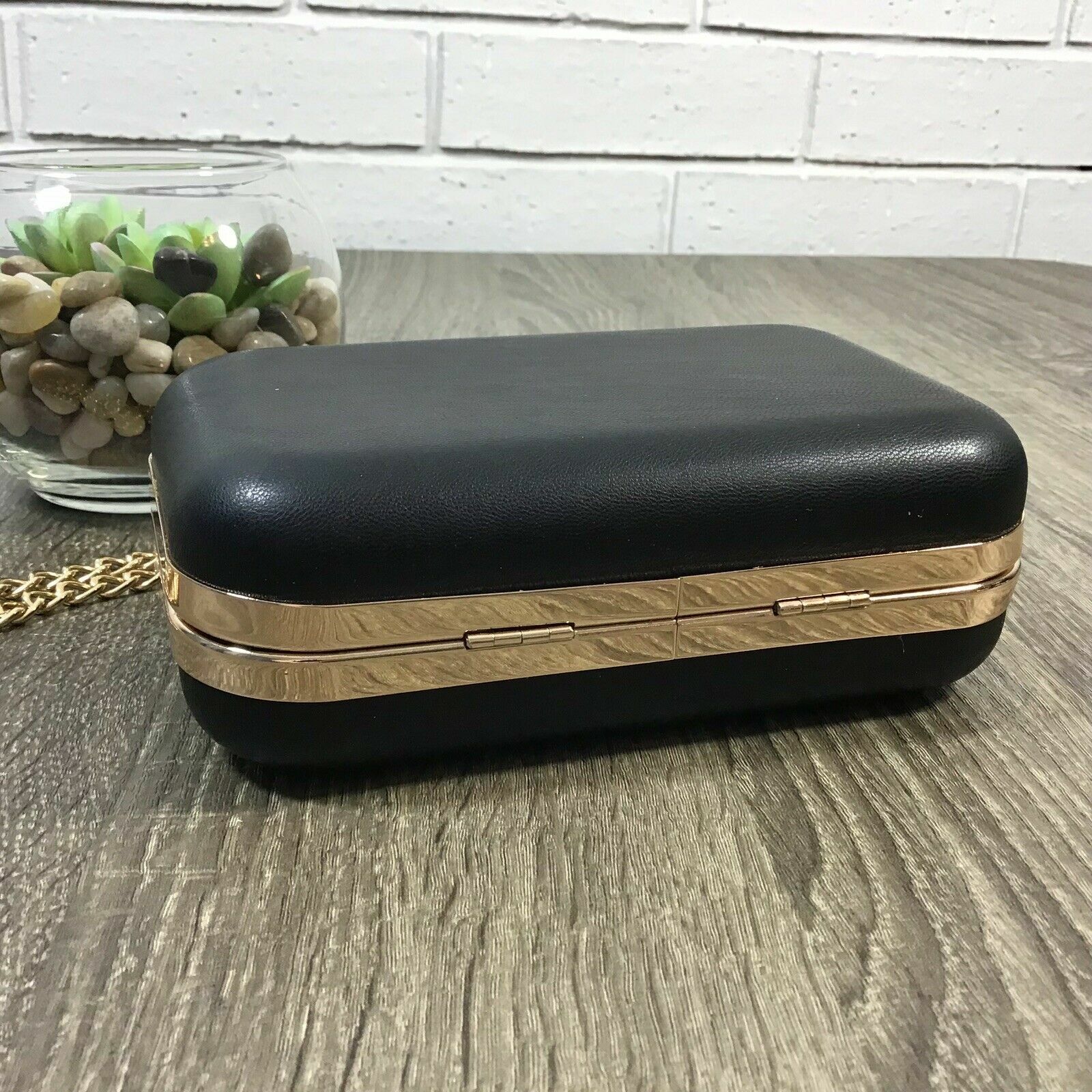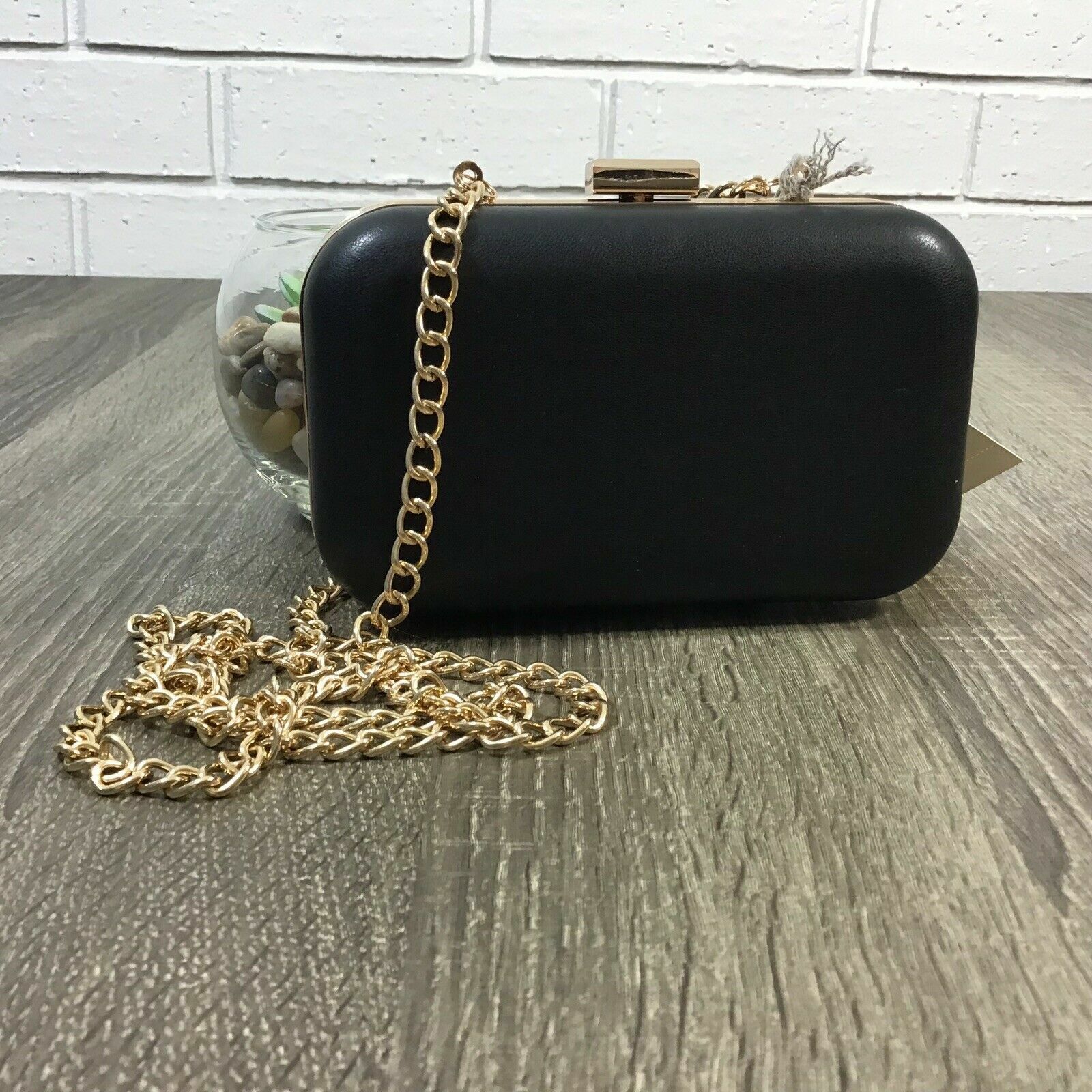 A New Day Funda Rígida Clutch Bolso Negro Oro Detalle Desmontable Cruzado Cadena