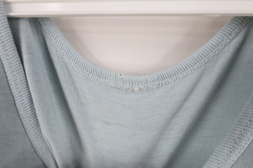 Holes collar, right armpit, bottom hem. Thin fabric. Dark spots, pilling. Collar, armpits discolored. Graphics, color faded