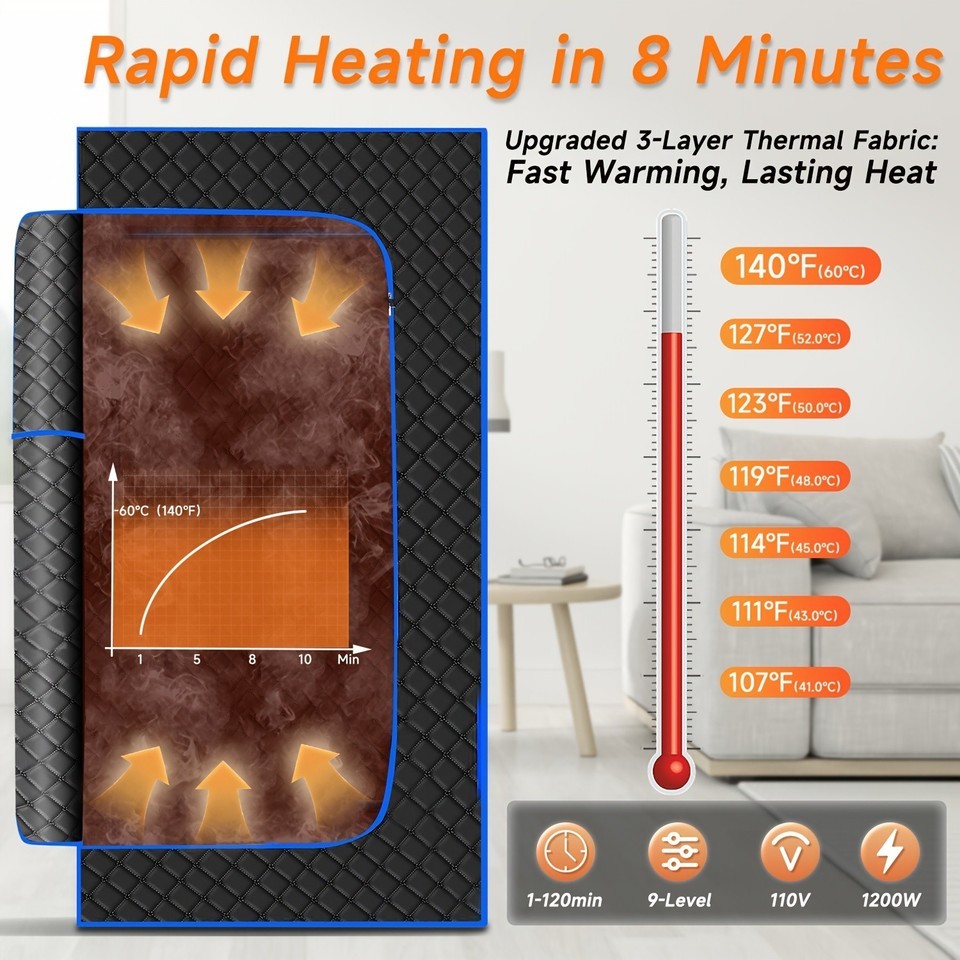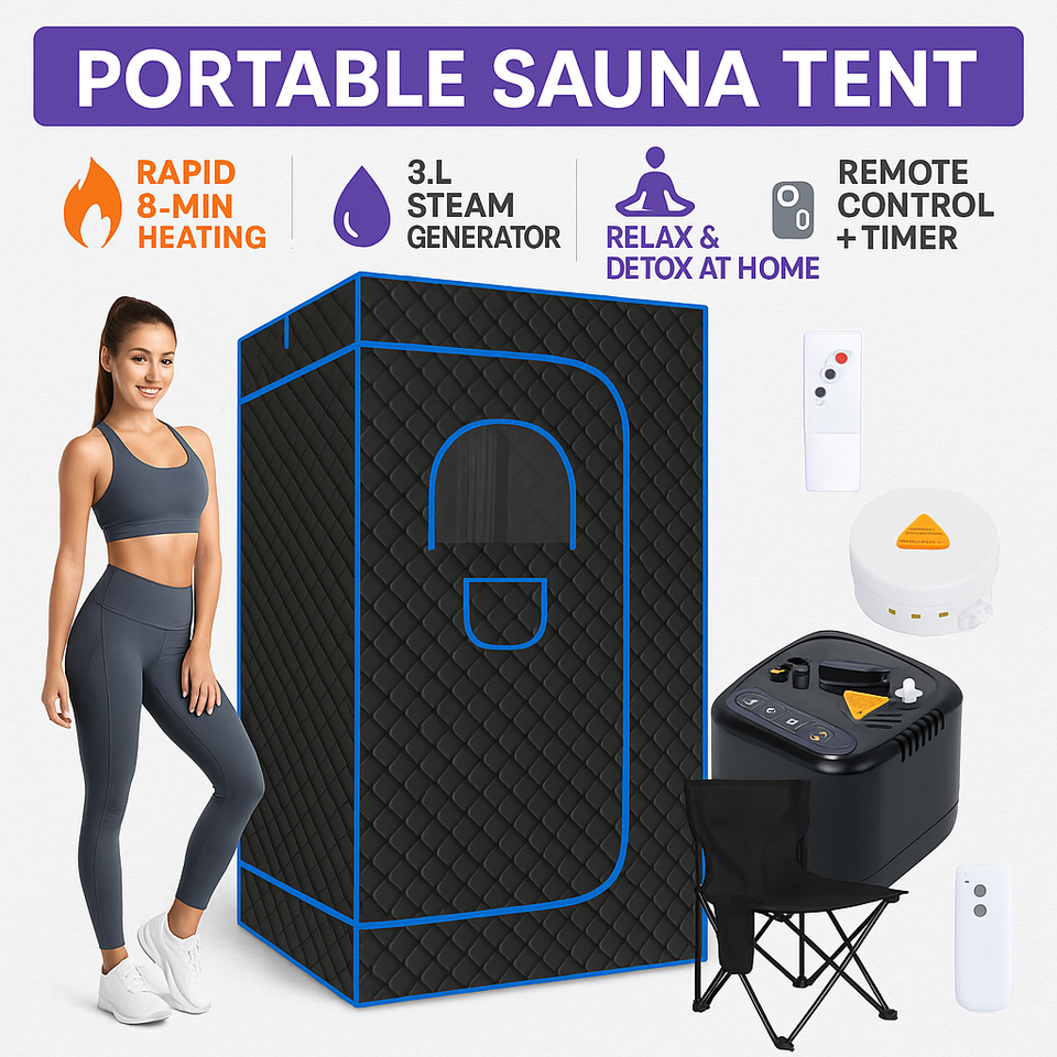 Enjoy a relaxing, spa-quality steam session from the comfort of your home with this Portable Full Body Steam Sauna Tent. Designed for detox, stress relief, and weight management, it features a powerful 1200W steam generator and high-efficiency 3-layer thermal fabric for rapid heating up to 140F in just 8 minutes.