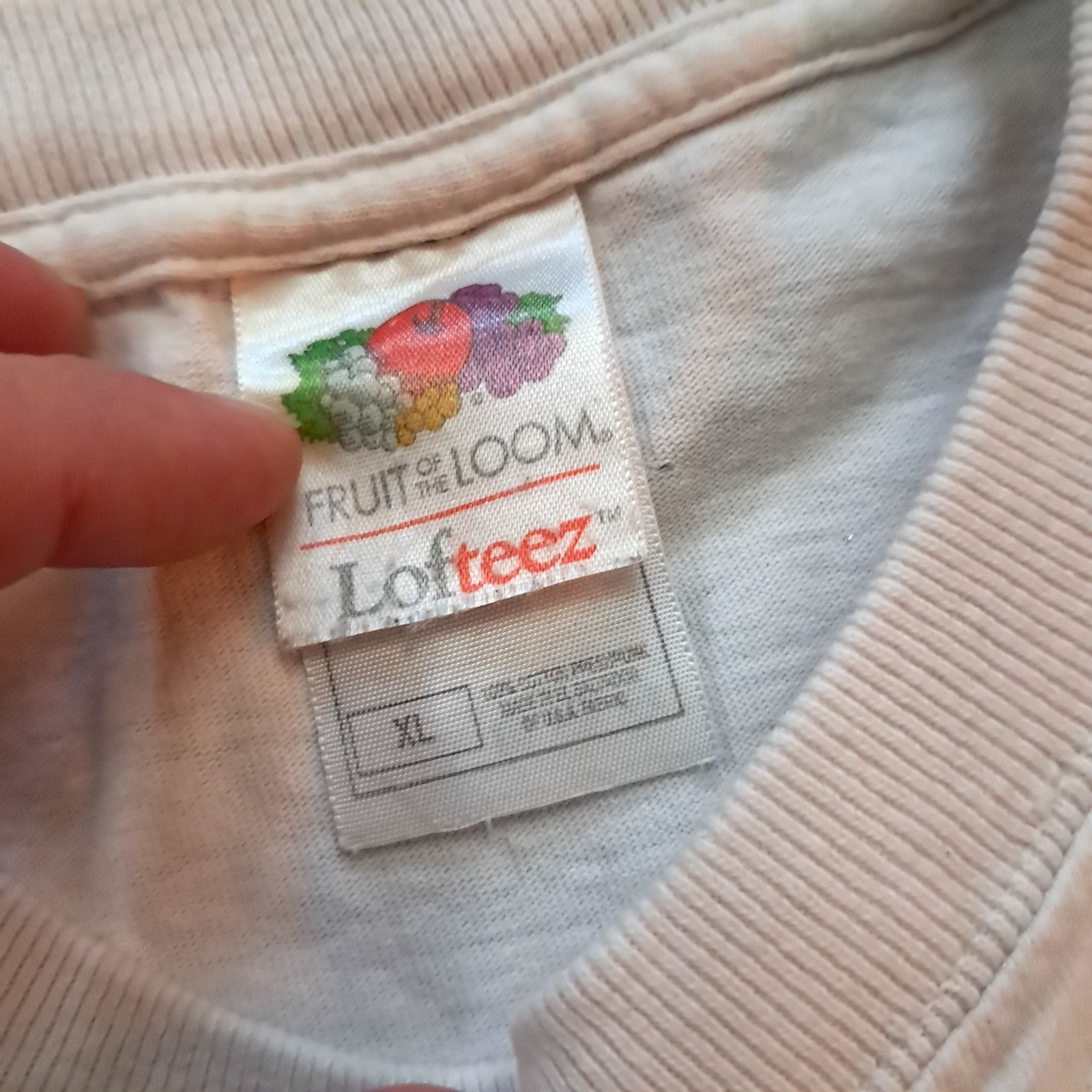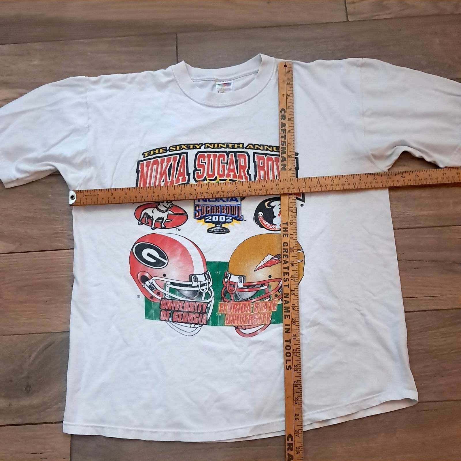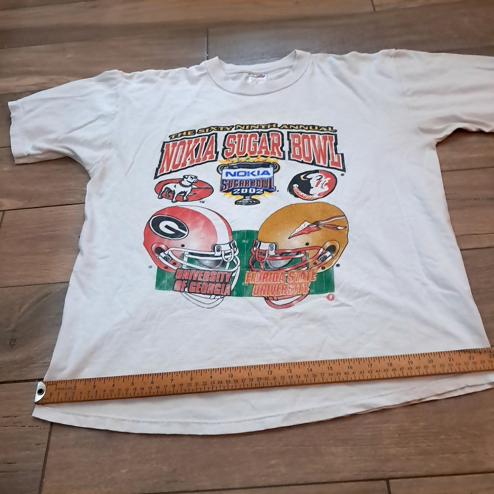 Fruit of the Loom shirt size X-large. From 2002, features Georgia Bulldogs and FSU Florida State University. White, but it is a bit dingy and not as bright as once was and Hem is a bit wonky. See pics for measurements and details.