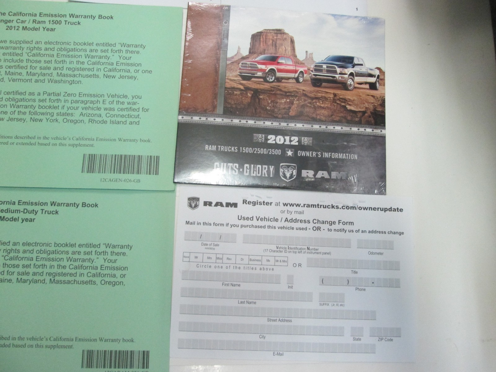 Supplement to the California Emission Warranty Book Passenger Car / Ram 1500 Truck 2012 Model Year Supplement to the California Emission Warranty Book 2500 / 3500 Medium Duty Truck 2012 Model Year We will leave POSITIVE Feedback after we receive your payment. Please do not forget to give us POSITIVE Feedback and FIVE Stars on all of the Detailed Seller Ratings! If you are not satisfied with your shopping Experience, please contact us to get a solution before you decide to leave a NEUTRAL or a NEGATIVE Feedback, We will do our best to solve any problems for you as soon as possible. We will provide you with the BEST POSSIBLE service because the POSITIVE Feedback and FIVE Stars are what we are striving for. Please email me through "My Messages" or "Ask Seller Questions" if you have any questi