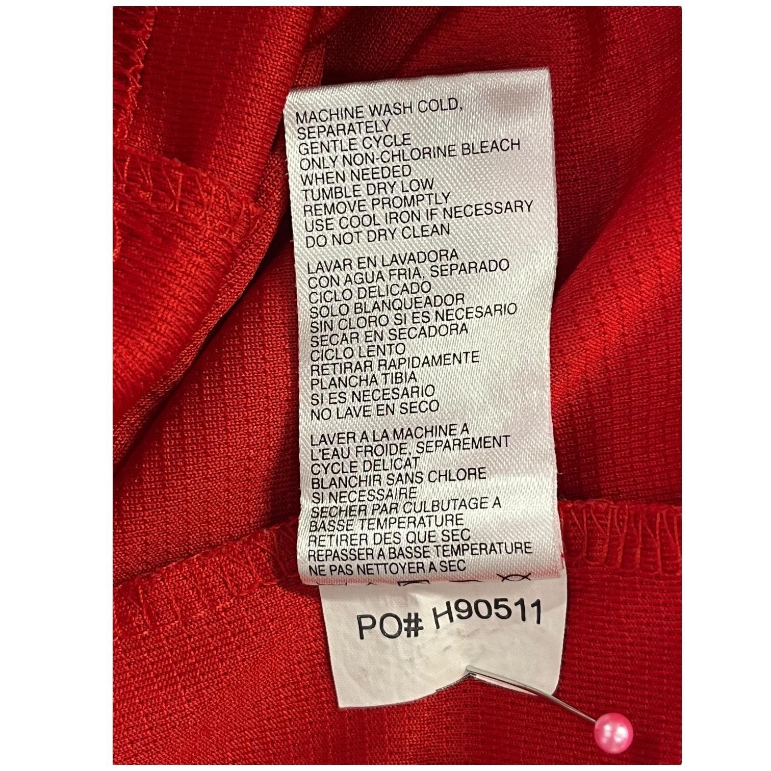 Color: Red with gray/white trim at collar and sleeve cuffs