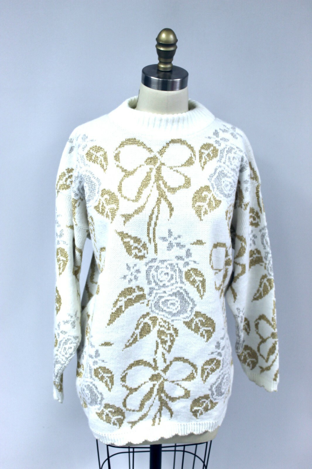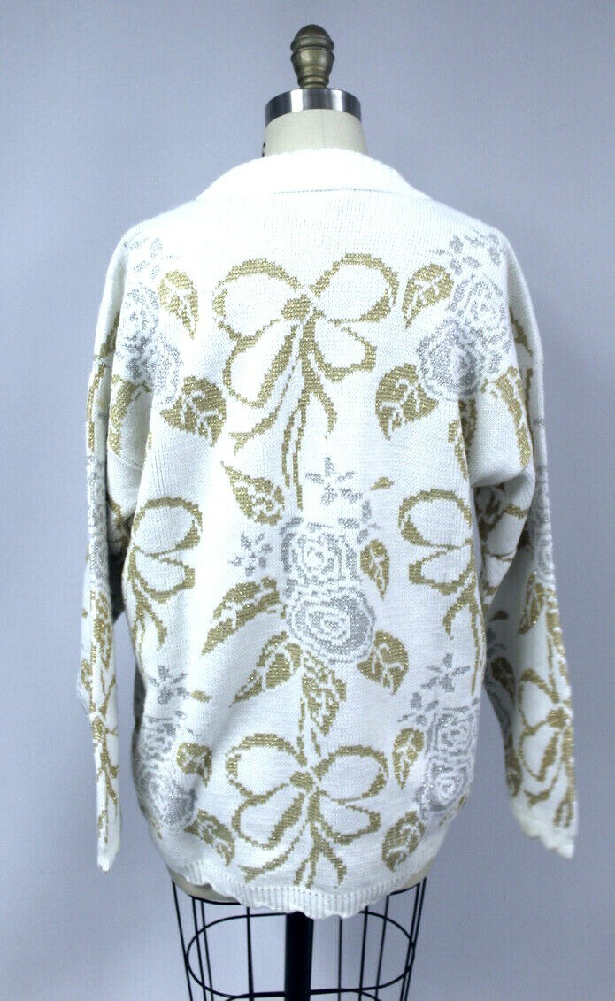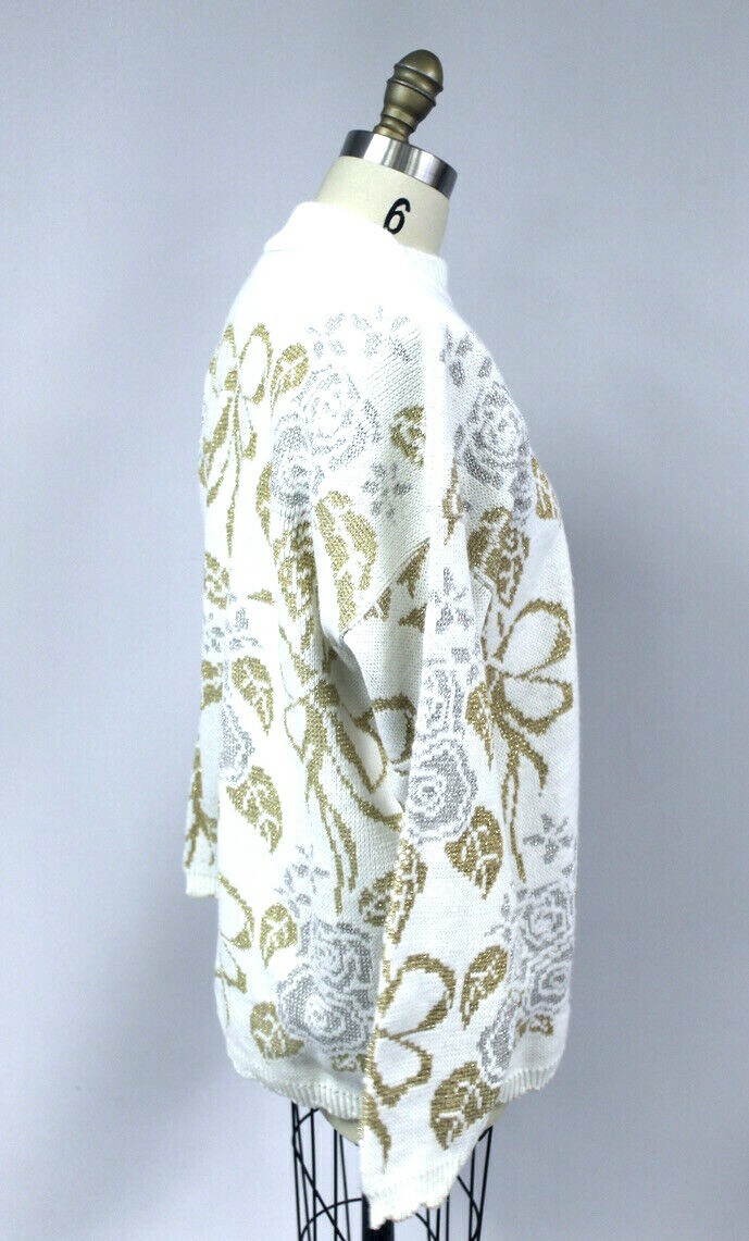 Dana Scott VTG Sweater 80's Sz M White Silver Gold Metallic Bling Bows Flowers-excellent clean condition, no flaws, no pilling.