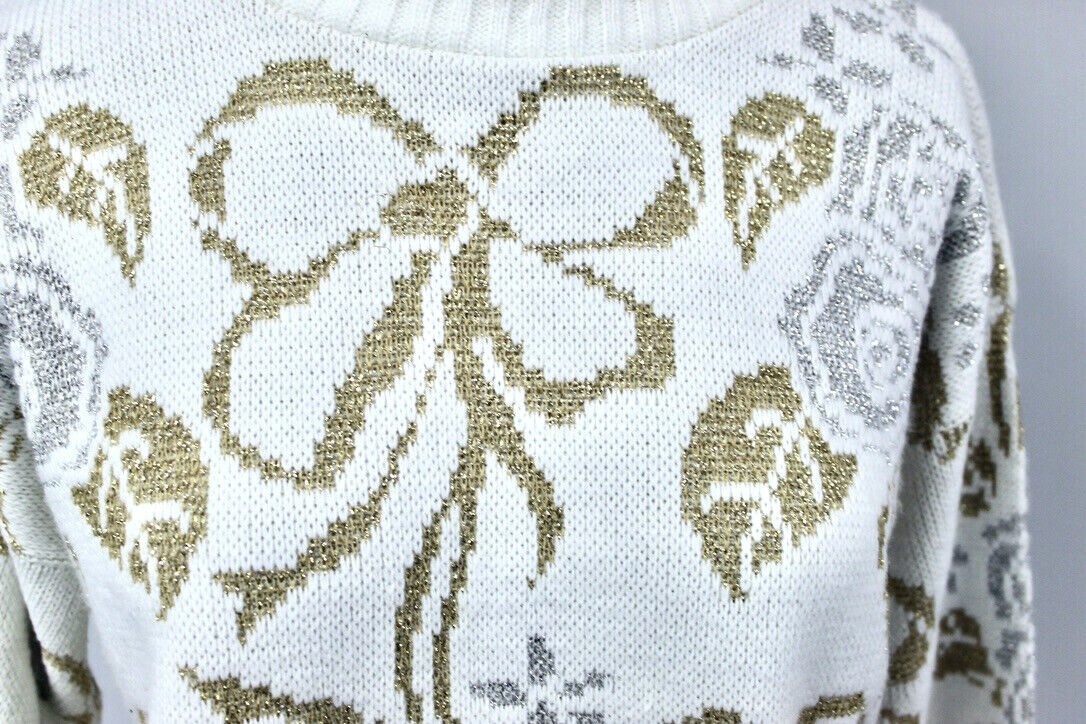 Dana Scott VTG Sweater 80's Sz M White Silver Gold Metallic Bling Bows & Flowers
