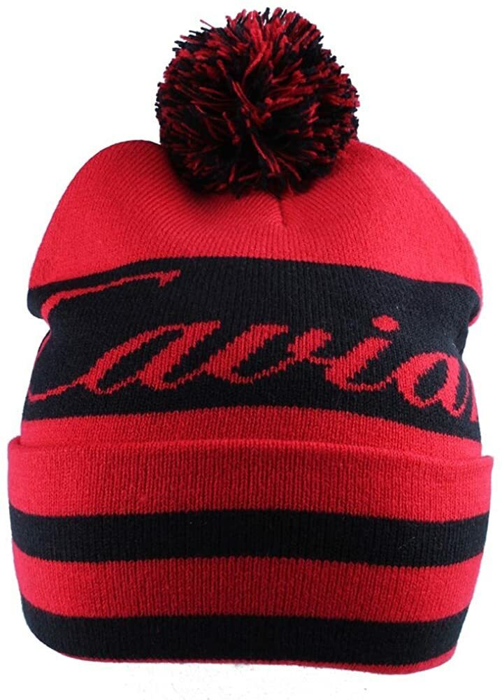 Bernio confuso con pom alla corona. Jacquard a strisce con design del logo dello script. Adattamento personalizzato. 100% a maglia acrilica. Importato.