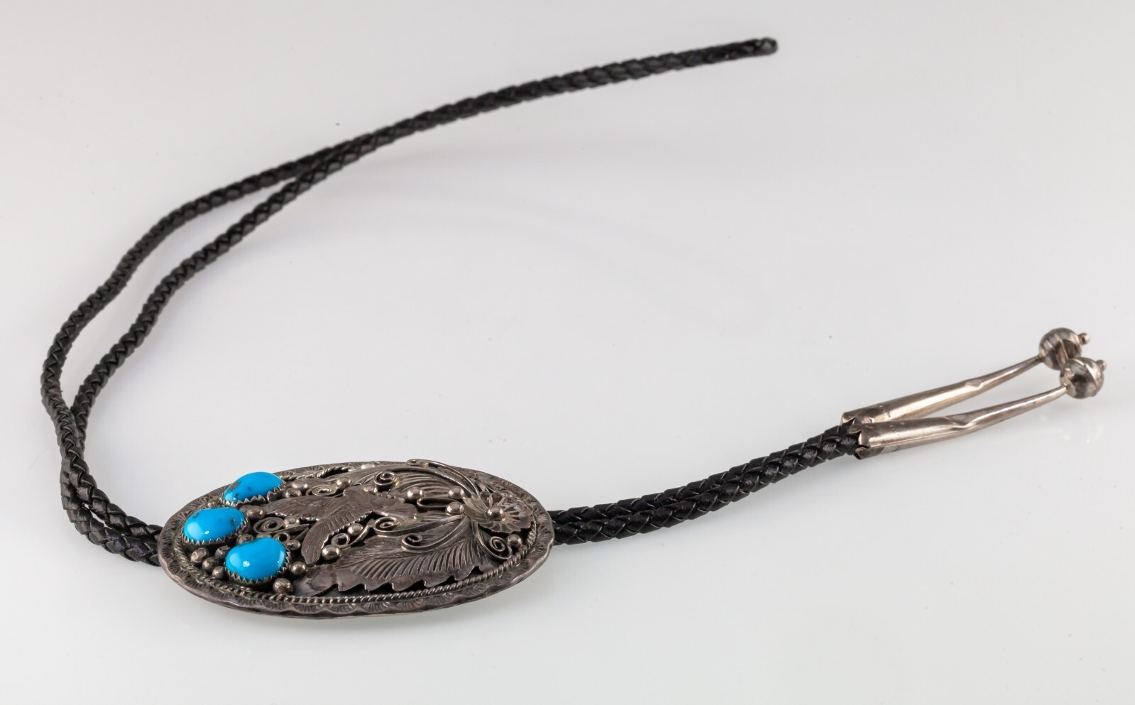 Argento Sterling Bolo Cravatta Con Turchese Intarsio Pollo Emblema E Pelle