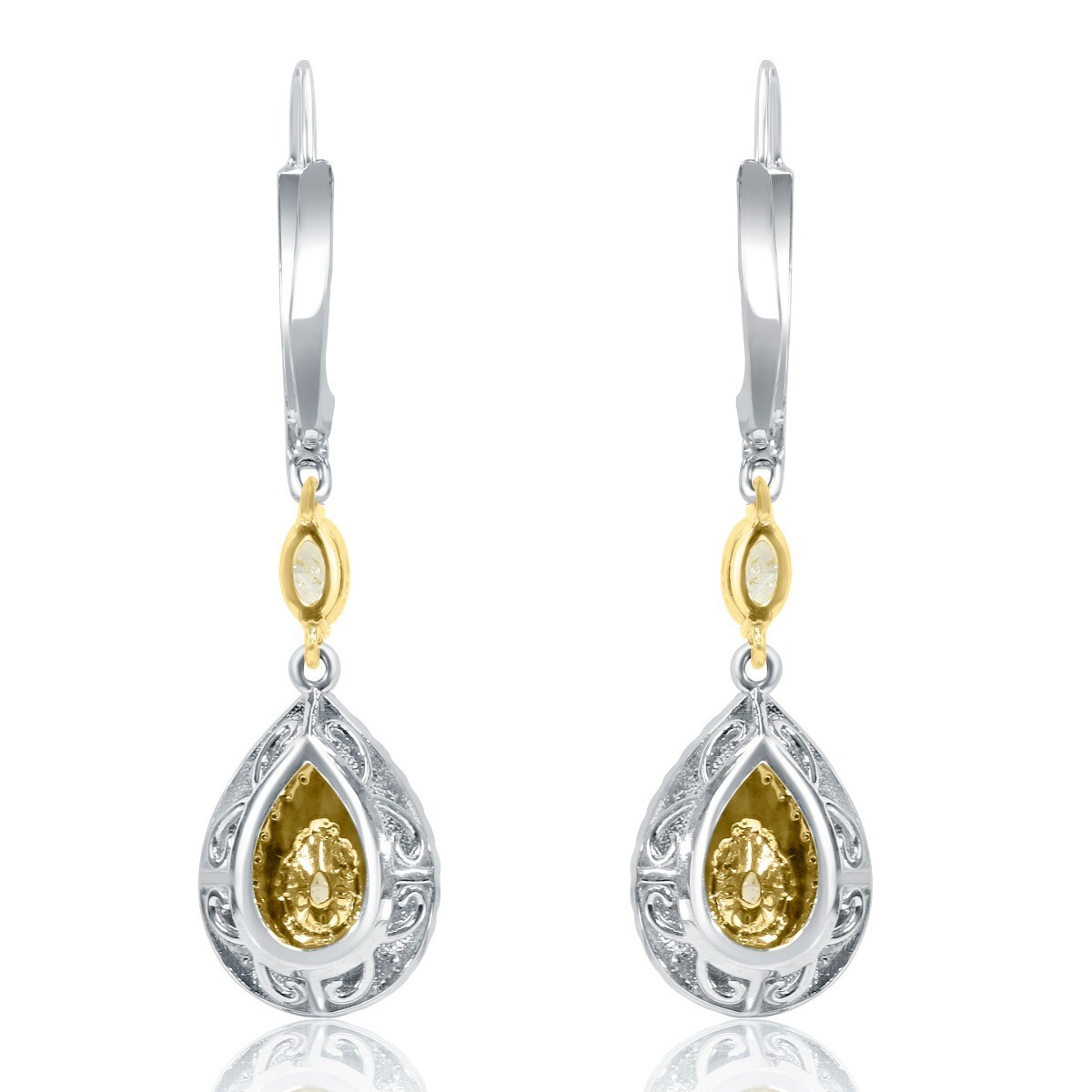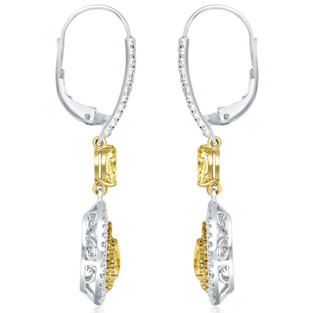 Diese Ohrringe handeln in 14 Karat zweifarbigem Gold und verfügen über 0,88 Karat-Pear-geschnittene natürliche, schicke gelbe Diamanten im doppelten Halo aus gelben und farblosen runden Schnittdiamanten in der Ernenten, die am Hebelverschlusspass mit einem Hebelverschluss von 0,62 CARAT OVAL Cut natürliche schicke gelbe Diamanten befestigt sind. Diese wunderschonen Drop -Ohrringe bieten einen spektakularen Schimmer und Glanz !! Das Gesamtkarat -Gewicht betragt 2,42 Karat.