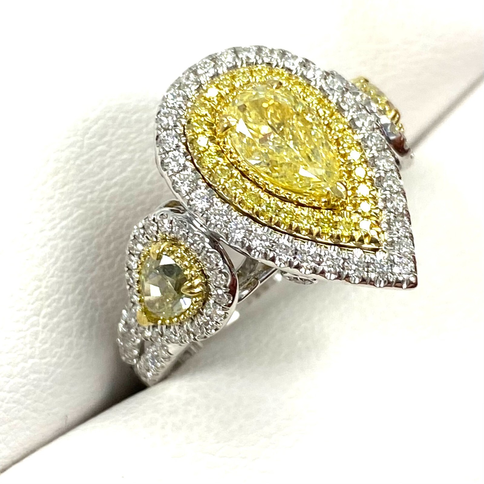 Dieser wunderschone Ring verfügt über einen mit 0,71-Karat-GIA zertifizierten schicken, hellgelben Birnen-Kut-Diamanten in der Mitte. Der Hauptdiamant ist von zwei Halos umgeben - der innere Halo funkelt mit gelben Diamanten, wahrend der außere Halo farblose Diamanten für einen schillernden Kontrast bietet. Auf jeder Seite sind zwei birnenformige 0,60 Karat-Diamanten hinzugefügt, die zu seinem eleganten und einzigartigen Design beitragen. Das gesamte Meisterwerk spielt in hochwertigem 18K-Zwei-Ton-Gold-Gold, um sowohl Haltbarkeit als auch zeitlose Schonheit zu gewahrleisten. Unsere Produkte sind alle von Qualitat und Pflege im Herzen des Diamond District in der 47th Street in New York City hergestellt. Unser Engagement und unser Engagement für eine gute Arbeit und Qualitat übersteigen alle