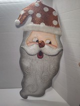 This festive decoration features a cheerful Santa face with a glittery bronze hat, white polka dots, and a soft faux-fur trim. The metallic embossed design and sculpted 3D shape give it dimension and shine ? perfect for front doors, walls, or holiday displays.