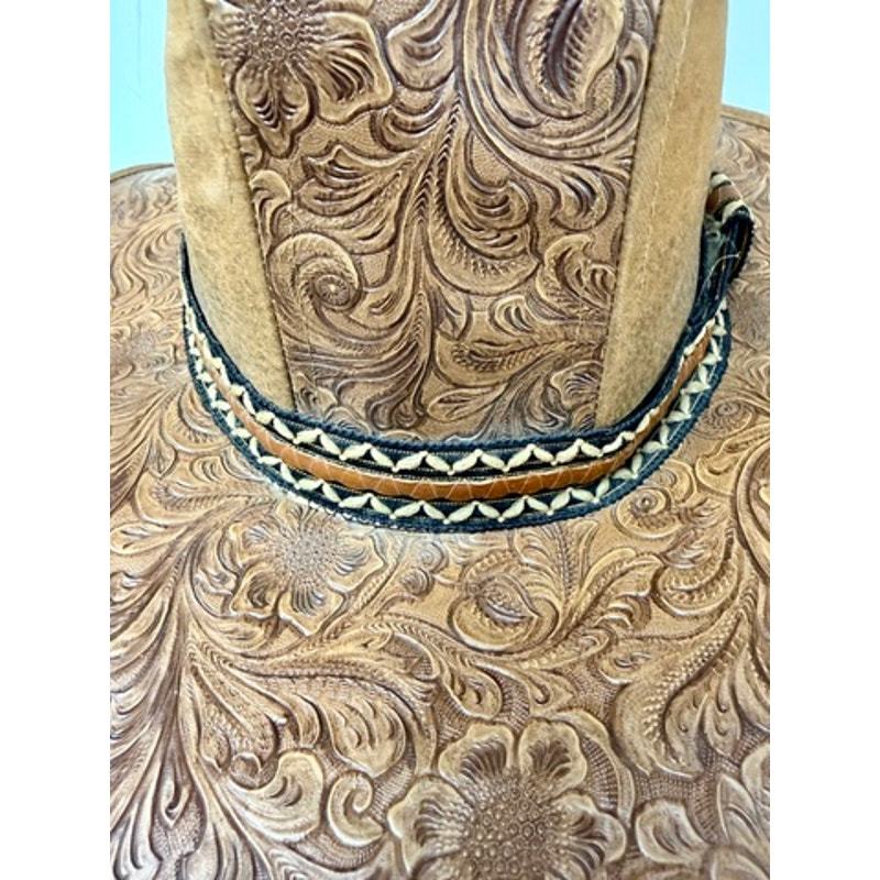 This exquisite vintage cowboy hat is crafted from richly tooled floral leather with a sculptural 6?7" crown and wide 15" brim. Its deep caramel brown hue, embossed scrollwork, and braided hatband evoke classic Americana?ideal for collectors, costumers, and Western style lovers. Beautifully made and Made in USA.