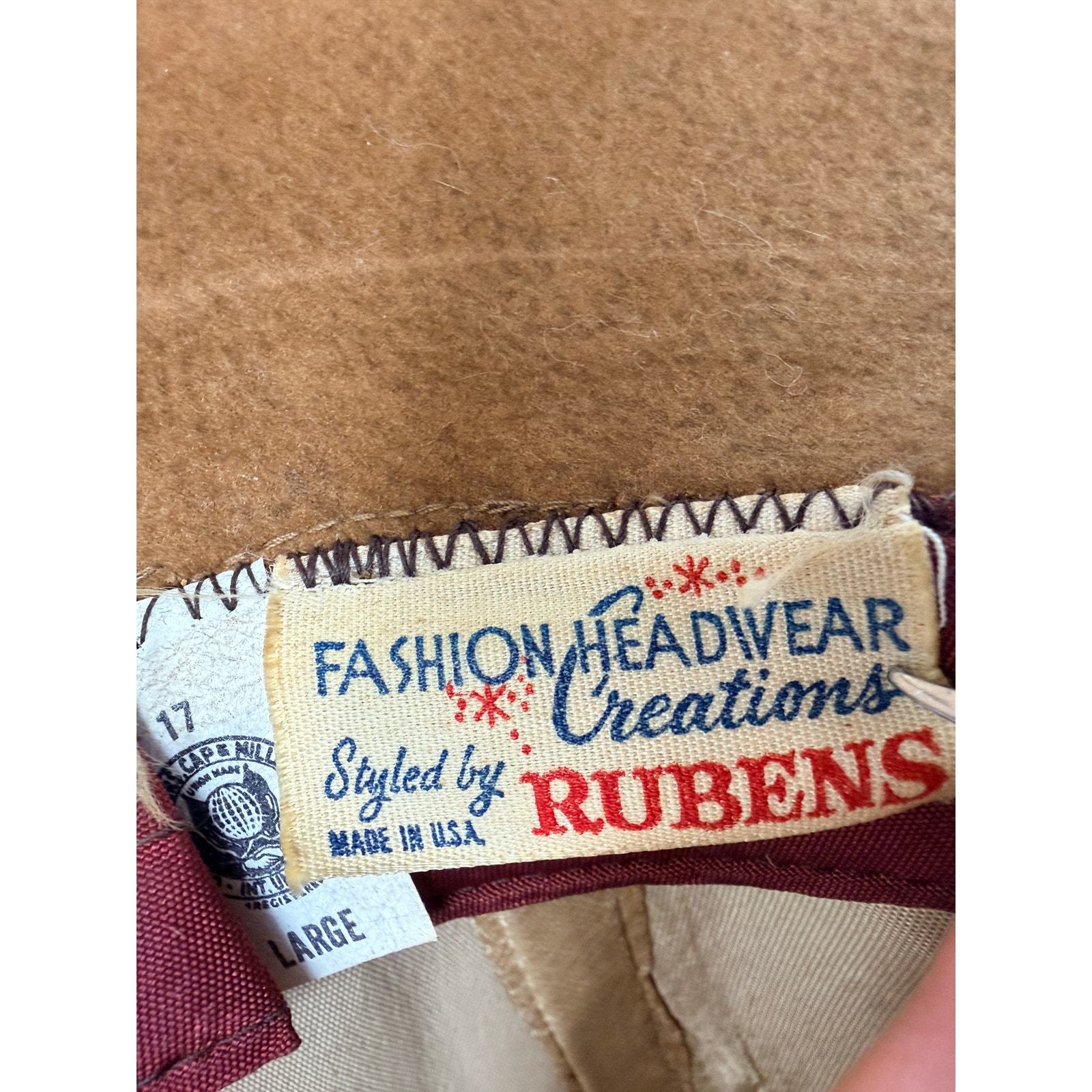 Styled by Rubens Fashion Headwear Creations, made in the USA. Features hand-tooled floral embossing, braided hatband, and satin interior lining. Union label present. Likely late 1960s?1970s.