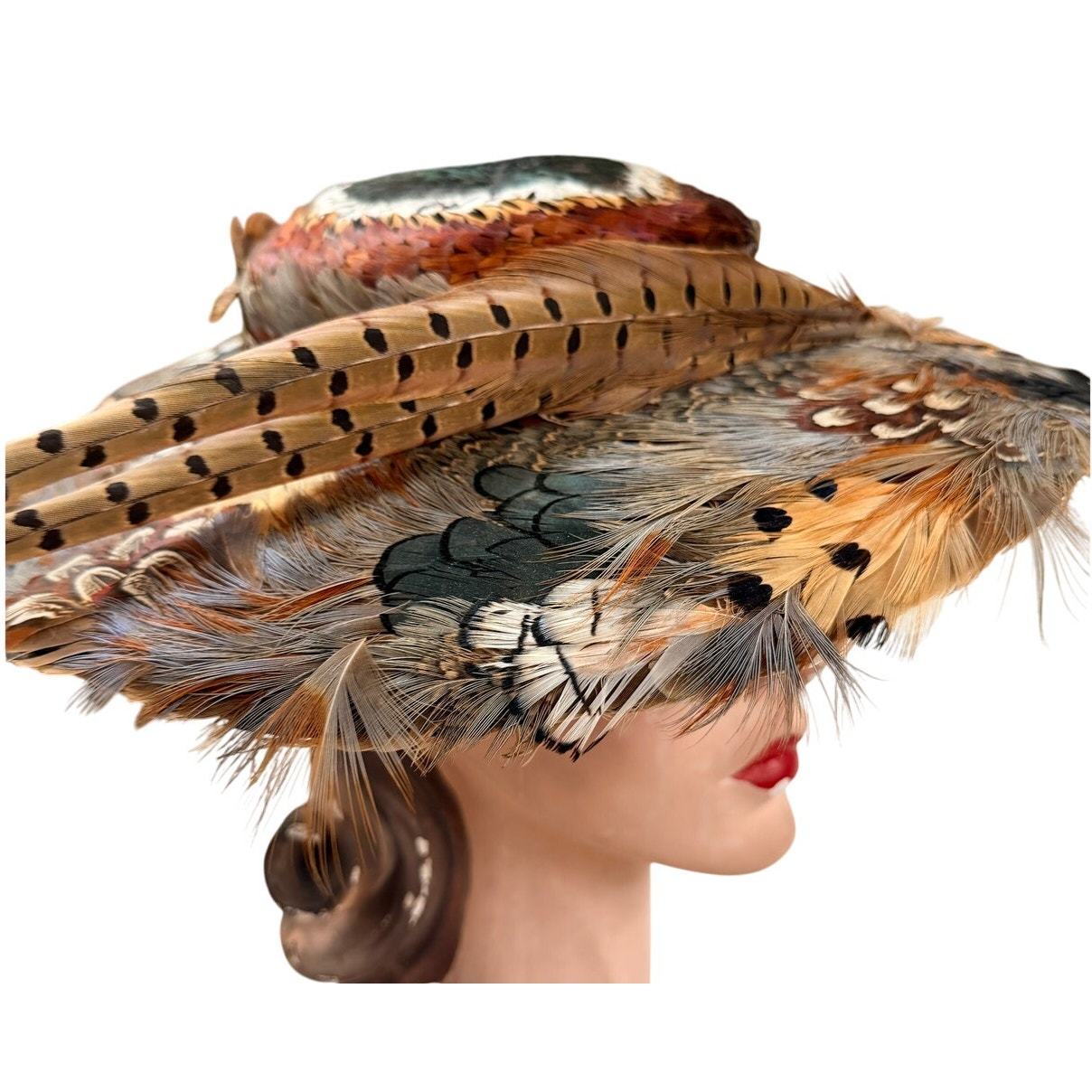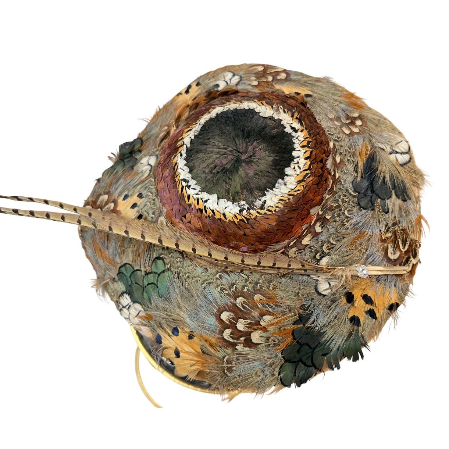 This spectacular mid-century statement hat channels pure Golden Age glamour. Handcrafted with lush natural pheasant feathers arranged in radiant concentric rings, it features two long dramatic tail feathers arcing across the crown. Velvet underbrim and interior ?ears? give a secure, comfortable fit ? one size fits most. It?s a stunning collectible piece that captures the elegance of late 1940s?1950s millinery craftsmanship.