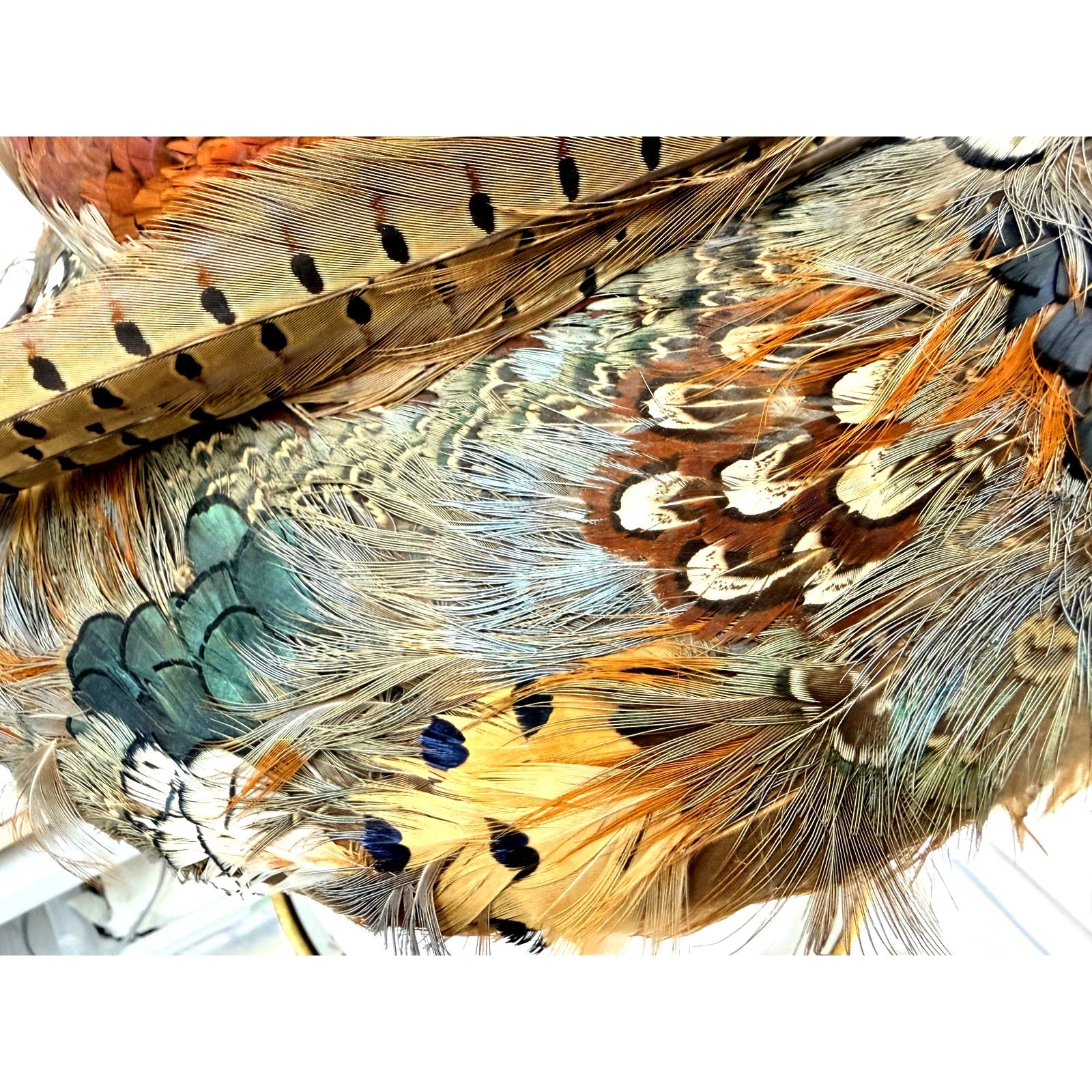 Natural pheasant feathers, velvet underbrim, grosgrain interior band.