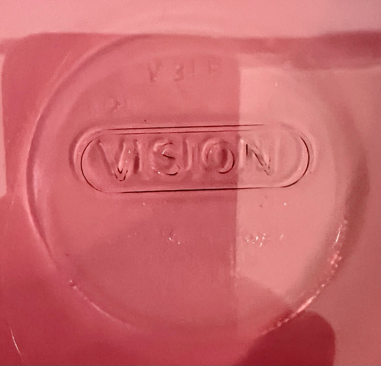 The Corning Vision Ware 24 oz 2.5 qt Cranberry Casserole Dish with Pyrex Lid is a vintage collectible cookware item from the 1980s. This round casserole dish is made of glass with a non-stick surface coating, making it suitable for use in electric and gas ovens, as well as microwaves. The set includes a lid, and it has a capacity of 24 oz (2.5 quarts). This original Corning Vision product is a sought-after item for collectors of kitchen and home memorabilia, especially those interested in retro kitchen gadgets and vintage cookware.